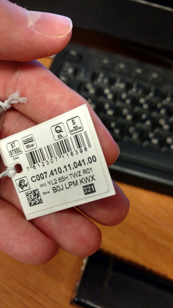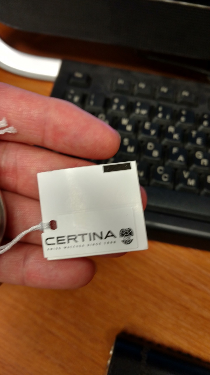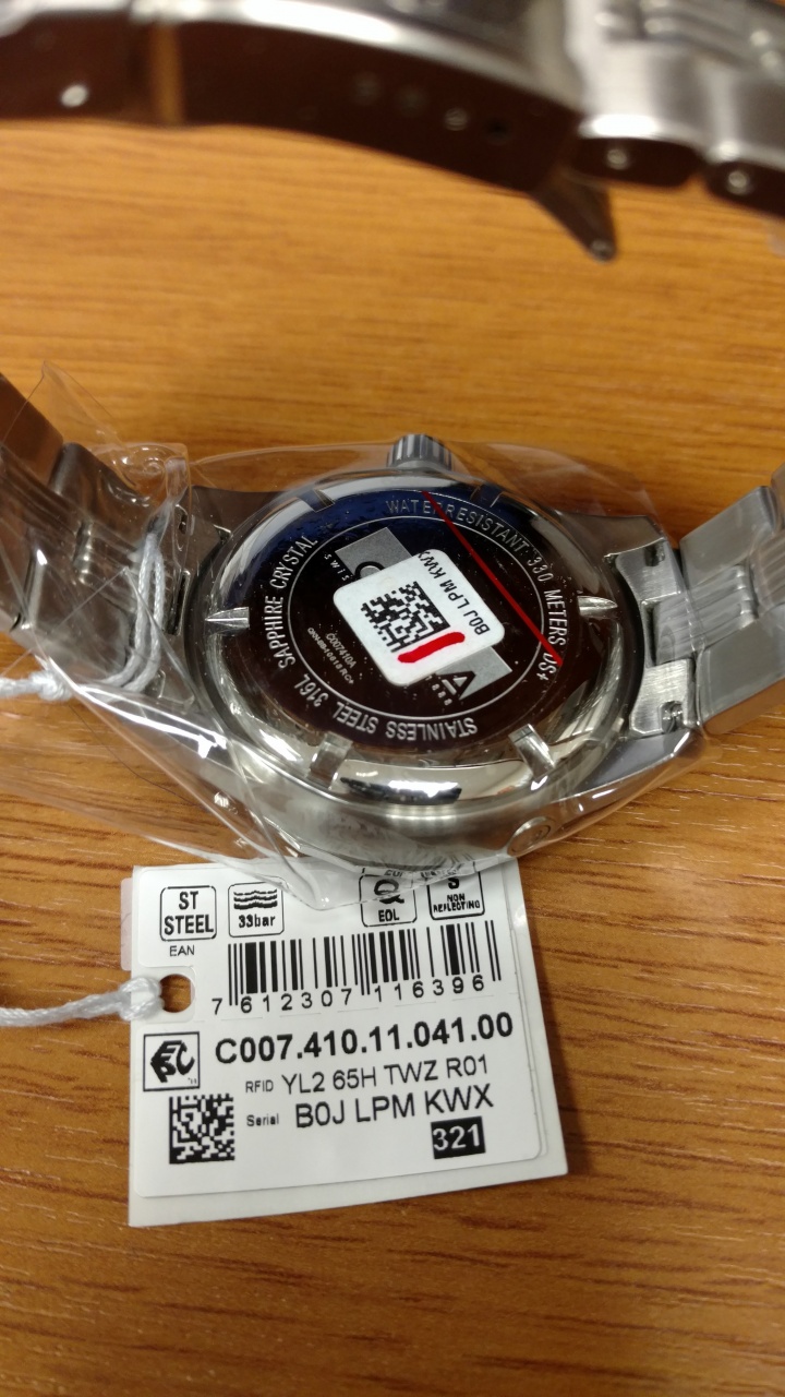 Нет никаких желтых кружочков, только синий на коробке. Наклейка сзади часов с QR, тонкая заводская. Бирка на часах более бумажная, наклейка с рефом/серийным поверх каких то мелких наклеек видимо с серийными для гарантийной карточки.