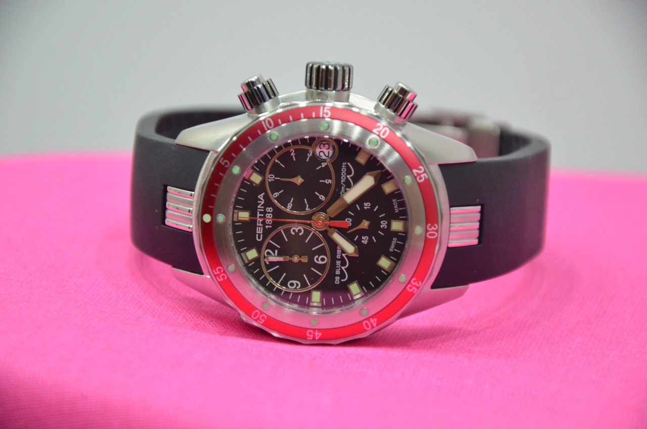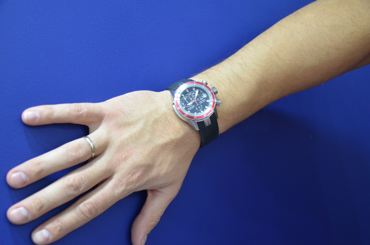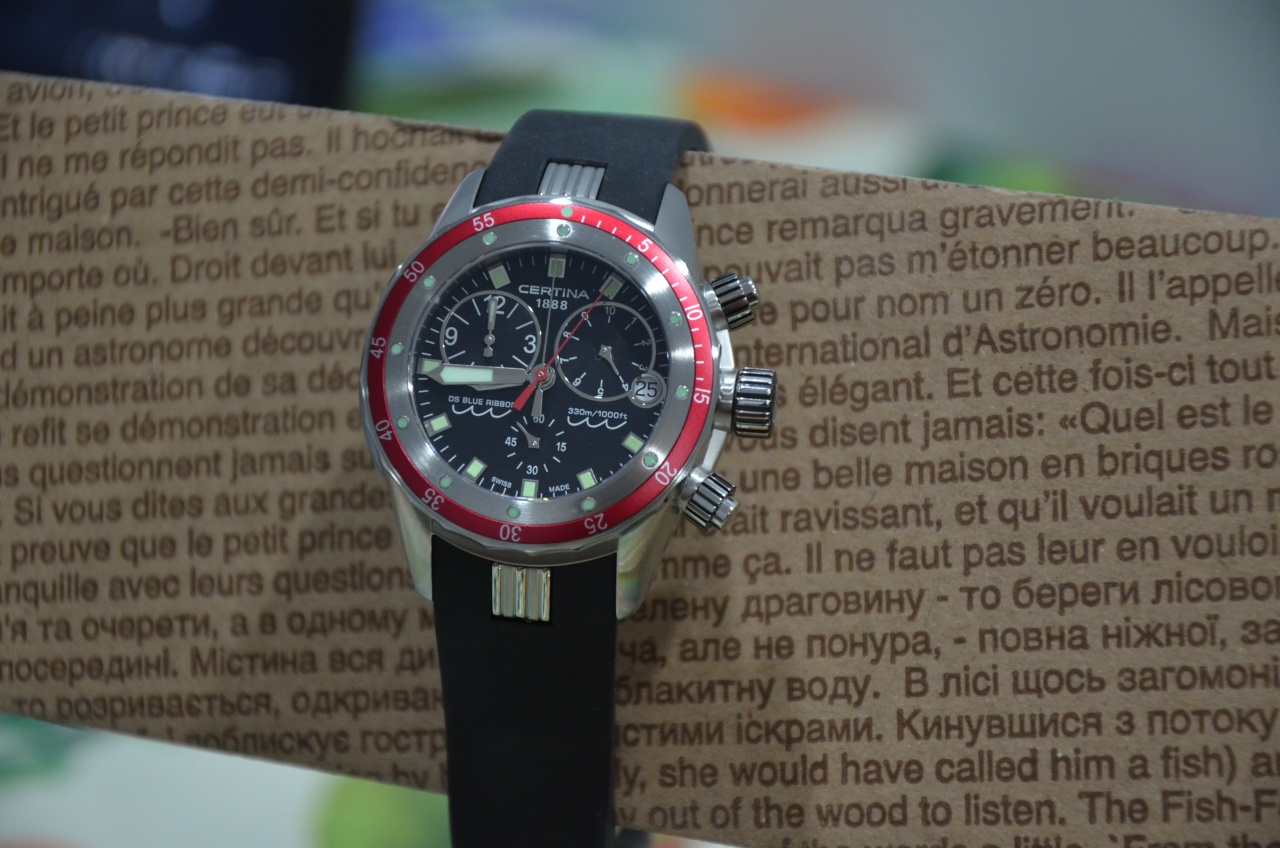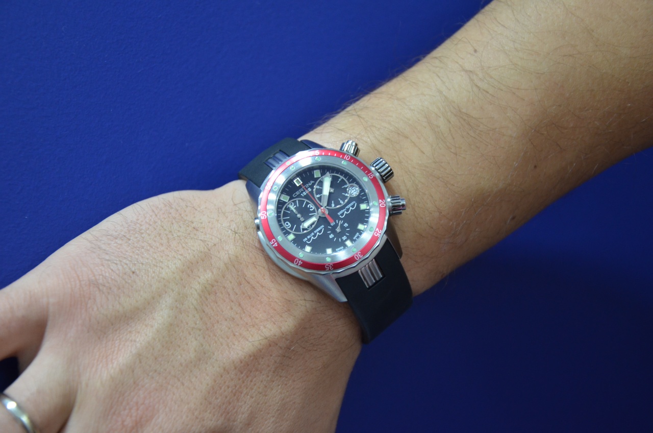 Blue Ribbon от Цертюшки, как мы ласково её называли у нас был, синий хрон на браслете и были просто трёхстрелочники. Но тут из коробки я достал её! Красный хронограф на каучуке, я влюбился с первого взгляда, это была вспышка, которую трудно объяснить. Нормально её примерять не получалось, так как каучук нужно было подрезать, а с казенными часами этого, ясное дело, не сделаешь. Вот так я и вздыхал каждый раз открывая витрину и протирая часы. Дольше всего я вертел в руках именно мою Цертюшку, красный хрон на каучуке. Она стоила немалых денег, но именно тогда я твердо решил, что она будет моей. Но время шло, у моей ЧБ настала ремиссия, хотя все мои хотелки были записаны черным по белому в екселевской таблице, но надежду найти Её я уже потерял.