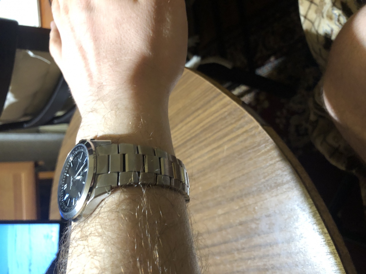 Из часов было вытащено 4 звена. Если вытаскивать 5-ое звено, то они становились впритык к руке. Остановился на 4 звеньях. Но вот не пойму правильно ли они сидят? Обычно я затягивал ремешок сильнее. Сейчас часы не прокручиваются, но ездят по запястью где-то на 5 см.