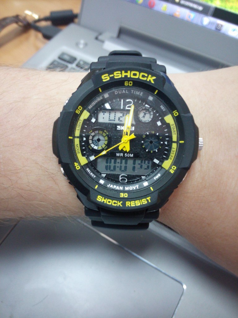 В общем часами доволен. Есть некоторые проблемы с точностью хода цифрового блока, но для цены в 600р уход вперёд на 12 секунд в месяц не критичен. Аналоговый отстал на 2 секунды. Благодаря пластиковому ремешку не царапаю ноут при работе, что очень удобно по сравнению с Tissot prc 200. Подсветка просто восхитительна.