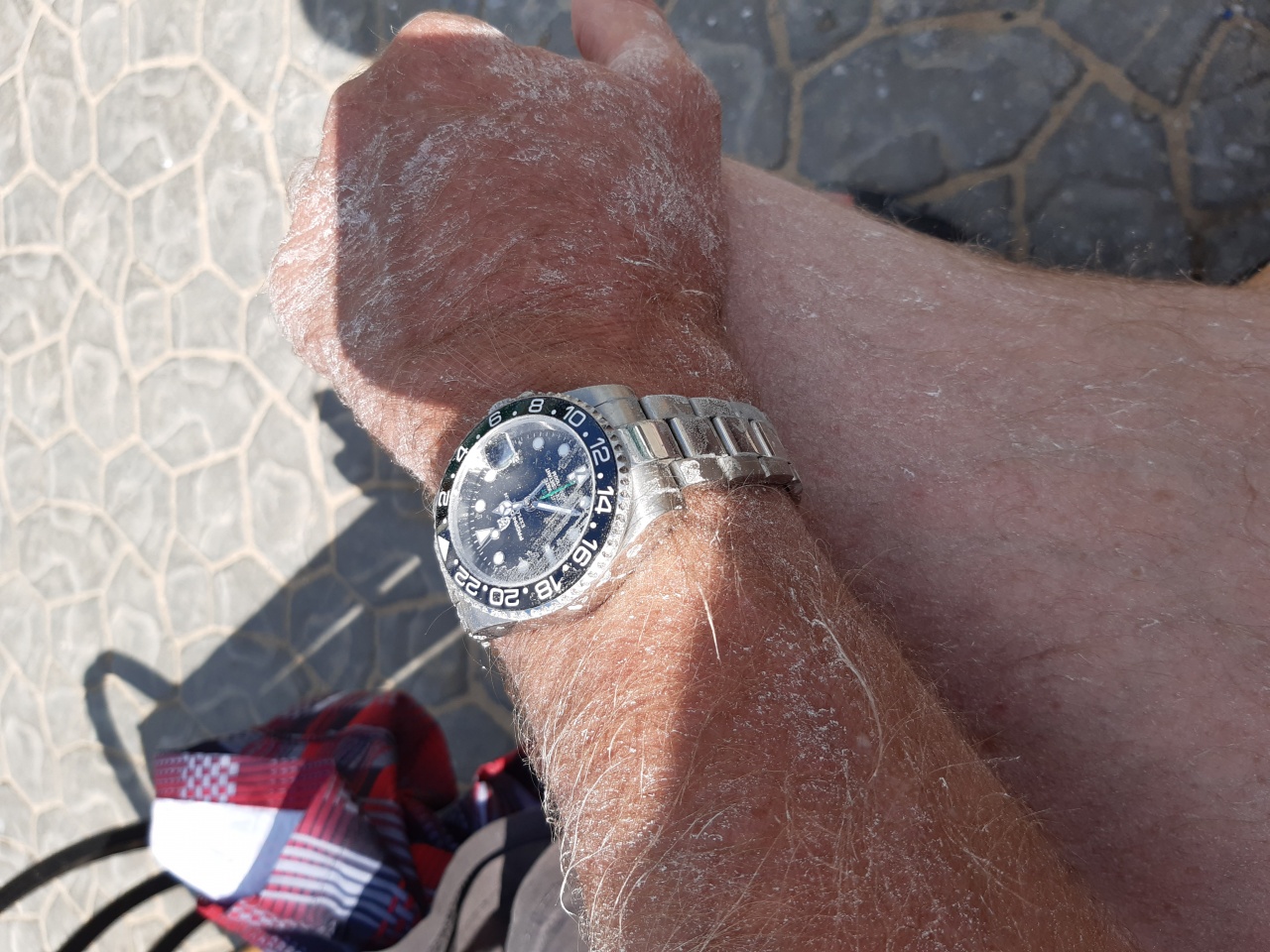 Часы вживую очень светлые, особенно «светится» циферблат - на фото в полной мере не удается передать это матово-серебряное лучистое свечение. Стрелки и метки (метки – накладные) – полированные. Окошко даты тоже имеет обрамление из полированного металла. Вообще, сам корпус и браслет полностью полированные. Для меня это плюс, я люблю, чтобы все блестело и сияло, да и ухаживать за полированной поверхностью лично мне проще. У меня есть дремель с насадками и алмазные пасты разной гритности, так что восстановить полировку часов и браслета проблем не составляет. А вот сатинирование качественно восстанавливать у меня не получается.