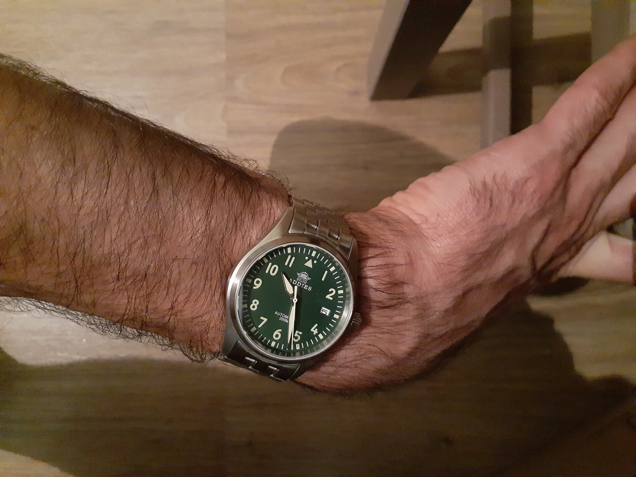 такой тип часов только в зеленом или бежевом циферблате должен быть, и, на мой взгляд, только для матового коричневого ремешка, желательно с 4 клепками, или для капронового зеленого или коричневого. Браслет вообще не в тему...