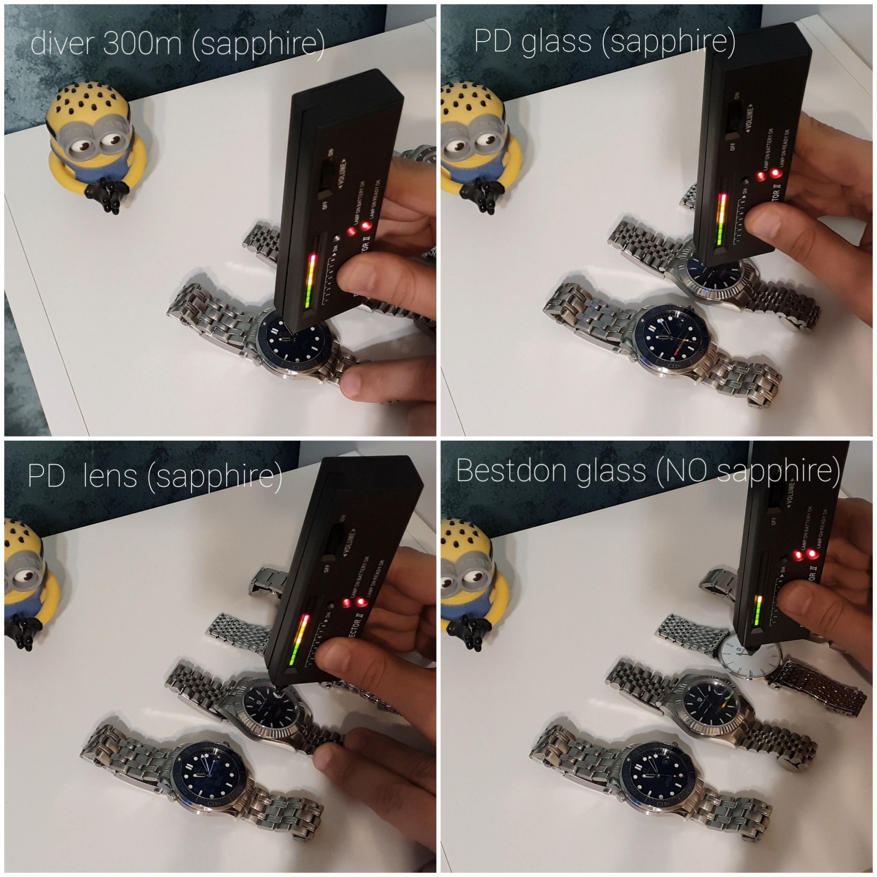 Для чистоты экперимента замерено вместе с часами,где никто в сапфире не сомневается (diver 300m) и замерен bestdon с хардлексом,покрытый непонятно чем,где капля ведет себя как на сапфире,но прибор не обманешь,не видит сапфира он там.
