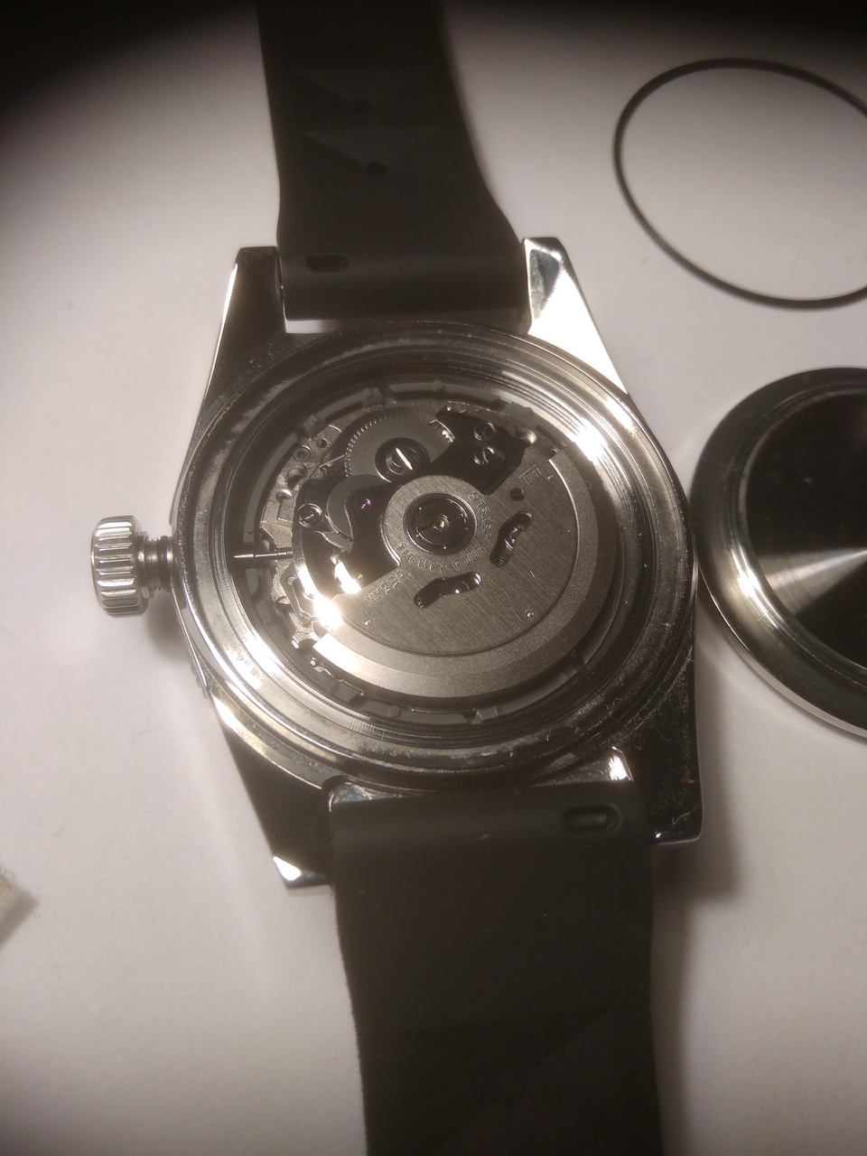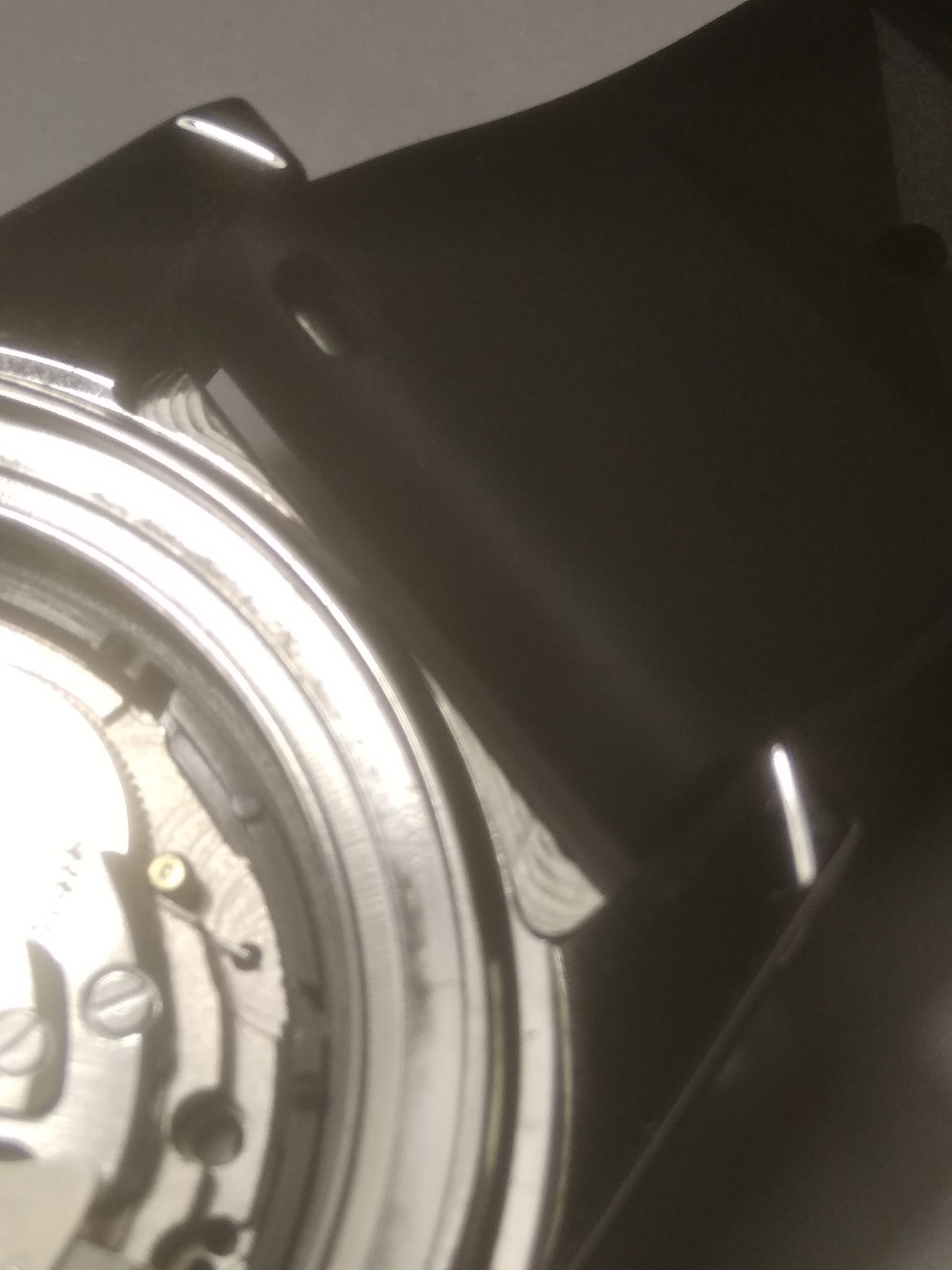 Взял со стерильным цифером, хотя лого там более или менее приличный. Основной минус – отсутствие антиблика. Стоит толстенный выпуклый сапфир (проверено прибором). Не стекло, а почти линза. За счет этого часы кажутся слепыми – масса бликов и игры света, хотя игра света в самом сапфире привлекает внимание светлыми окружностями внутри сапфира. Индексы стоят ровно и светомасса залита аккуратно. Безель с керамическим инсертом и стоит мертво: четкое вращение, ни намека на люфт и бэкплей. Люм только на метке. Цифер санберст серый – очень приятный цвет, специально взял такой. Между ушами корпус обработан лучше обычного – его полировали. Следы вырубки еле видно под углом. Со стороны крышки на выточке под браслет между ушами отчетливо видно следы инструмента. Голова на резьбе, футор длинный и с сальником. Резьба на крышке больше обычного, на самой крышке имеется гравировка Большой волны. Корпус по бокам зеркальный, сверху брашированный. На переходе верхняя-боковая поверхности зеркальной фаски нет, как на аналогичном SEESTERNе целиком брашированном. Люм хороший – суперлюминова, но только на стрелках и на метке безеля. На индексах люм не похож на обычный китайский, который светит ярко первые 5 мин, а потом тухнет навсегда. Этот люм светит еле-еле, тускло, сколько его не засвечивай, но долго, так же, как и на стрелках. Похоже на сильно разбодяженную люминову