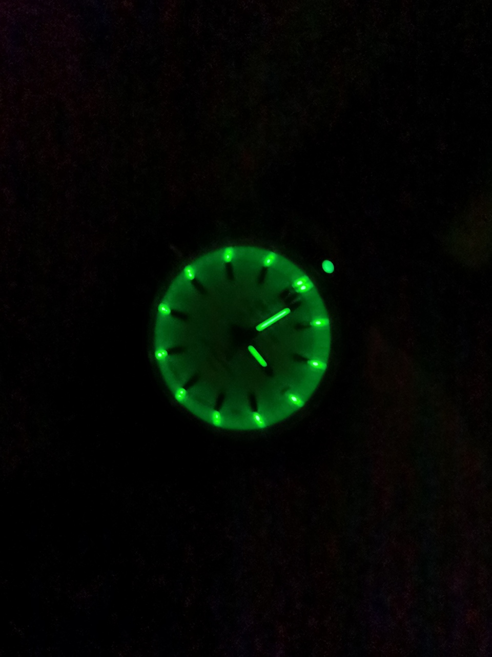 • Светомасса. То, что на стрелках и на циферблате она разной яркости — полбеды. Люминова от метки к метке светит по-разному, и когда ты с солнца ныряешь в тень, часы смотрят на тебя вот так О_о. Через пару секунд особо яркие метки притухают, картинка практически выравнивается, но первое впечатление — "Ээээ, это чё?"