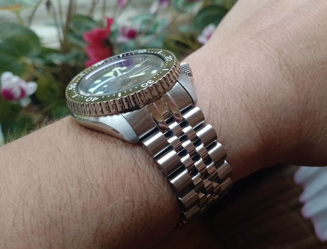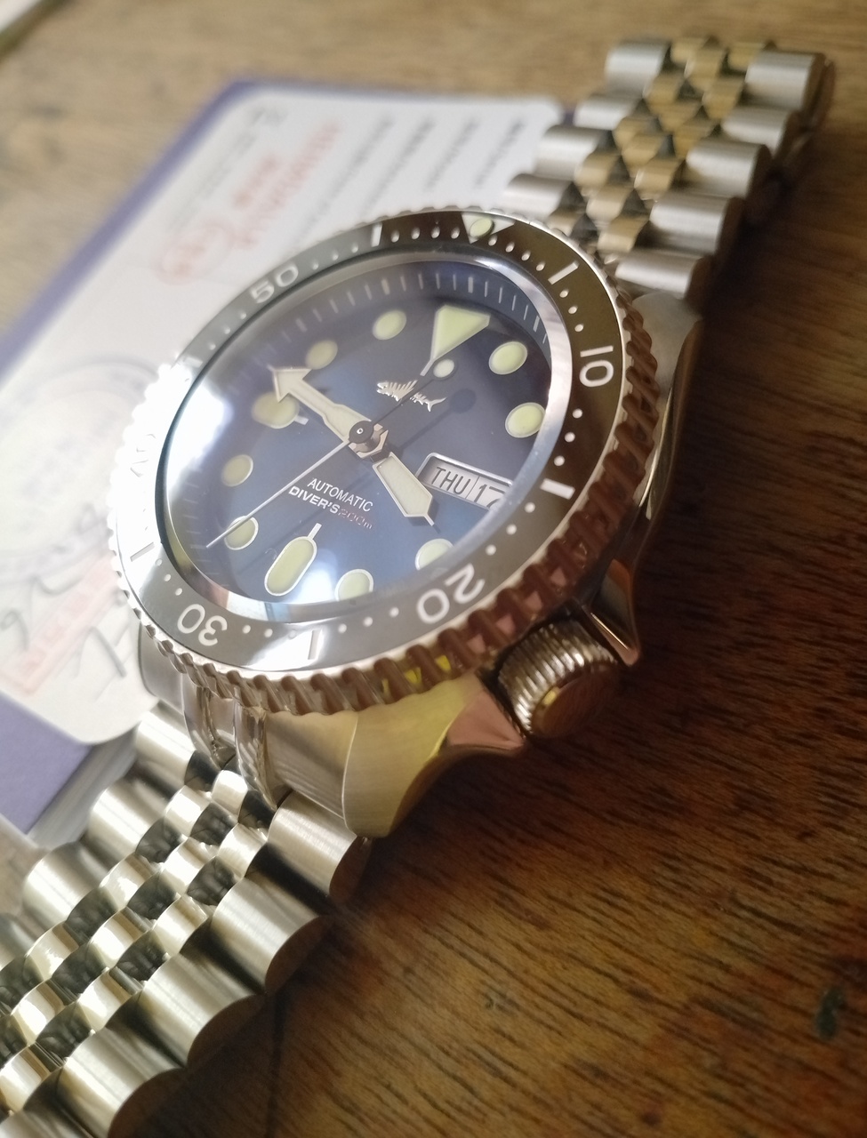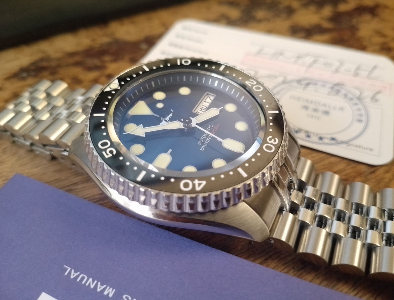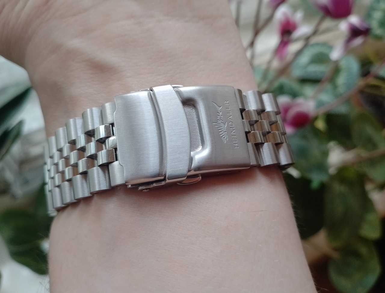 Приехали ко мне часики, хомаж на Seiko SKX007 от HeimDallr. Очень понравились, как и ожидалось - качество на высоте, заказал опять от HeimDallr, потому что у меня уже есть часы от этого китайского бренда (хомаж на Seiko Monstr v3 в бардово-рубиновом варианте). Исполнение очень понравилось, качество отличное, цвет циферблата - это просто нечно неописуемое, на фотографиях у продавца он смотрится как чёрный, хотя заявлен как синий, на самом деле, в живую, он почти чёрный с очень глубоким отливом в тёмно-тёмно синий (чернильный), я бы сказал - цвет ночного океана - класс! Я как раз не хотел синий, а хотел почти чёрный, так и есть. То ли это играет антибликовое тёмно-синее покрытие стекла, то ли циферблат имеет такой классный оттенок. Сапфировое стекло имеет небольшую фаску по краю, что придаёт дополнительного шарма, метки чуть преломляются при некоторых ракурсах. Взял специально на юбилейном браслете, никогда не было у меня такого, а обычный трёхзвенный ойстер как-то уже поднадоел. Снял четыре звена, в комплекте станочек и мини-вилочка для снятия шпилек, талончик гарантийный и книжка-мануал. Коробка сама добротная. Вообще, у HeimDallr традиционно - отличная комплектация и упаковка, определённо могу сказать, что это теперь один из моих любимых микро-брендов. Отделка по корпусу очень аккуратная, стекло - сапфир, безель имеет керамическую вставку и левостороннюю трещётку на 120 кликов, причём вращение очень приятное на слух с характерным сдвоенным щелчком, очень классное! Заводная головка большая, ухватистая и имеет очень большое количество витков, что здорово! Юбилейный, пятисоставной браслет выглядит довольно просто, но я от него и не ждал каких-то чудес особенных, застёгивается, удобный, да и ладно; укорачивается легко, в комплекте станочек для выталкивания межзвенных шпилек. Люм заявлен C3 швейцарская люминова, по факту, она и есть, светится очень сильно от кратковременного засвечивания любым источником света, как долго будет светиться, не знаю, кому интересно, могу отписаться завтра. Давно хотел этот вариант дайвера хомаж на SKX007, необычные стрелки, большие круглые метки, отличная читаемость! Долго изучал тему рождения SKX007 от самых первых дайверов Сейко 62MAS и до Seiko 5, дизайны на столько похожи, что не понятно, собственно, на какую модель это хомаж, то ли на SKX007, то ли на Seiko 5, но получилось классно. Длиннющая секундная стрелка с точкой-противовесом очень эффектно смотрится. Часы не тяжёлые, видимо, отчасти из-за юбилейного лёгкого браслета. Что могу сказать: приятно держать в руках, приятно на них смотреть, приятно их носить, реально получаю удовольствие от использования! Могу снять видео, если кому надо. Короче - рекомендую. В плане цены, средняя цена на известной площадке варьируется от 12 до 16 т.р. Мне удалось ухватить за 11800р. по акции!