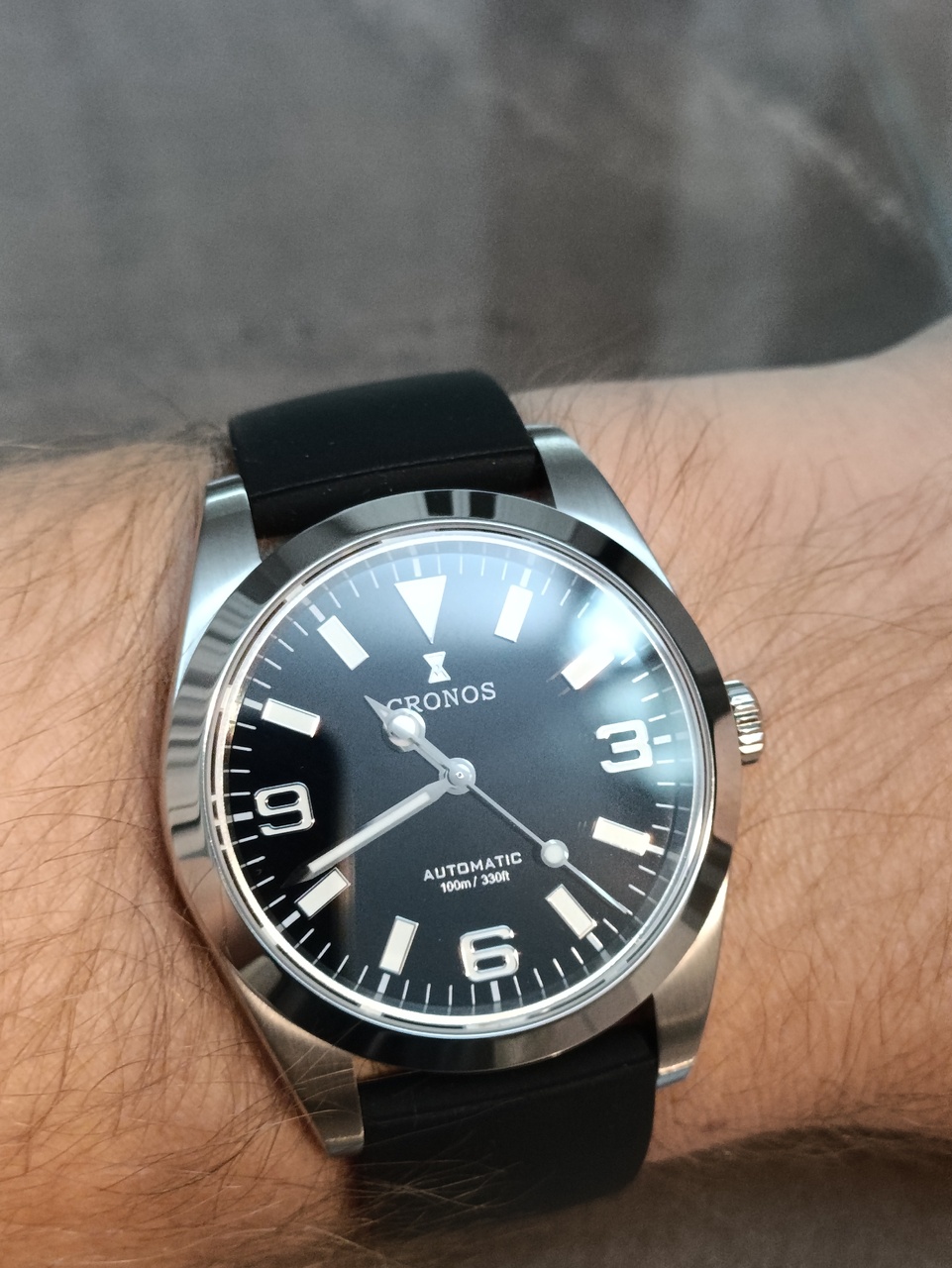 Даже довольно убогий накладной логотипчик не особо раздражает ввиду своих крошечных размеров. И да, он симметричен относительно надписи cronos. Люм на метках и стрелках оказался желтее, чем предполагалось, но хотя-бы везде одного тона. Светит отменно. Недорослая и худосочная часовая стрелка тоже особого отторжения не вызывает. Размер 39мм - прекрасно подходит на запястье 17-18 см. Хорошо что не взял 36. На браслете ещё было-бы в натяг, на ремешке смотрелись-бы совсем крошечно.