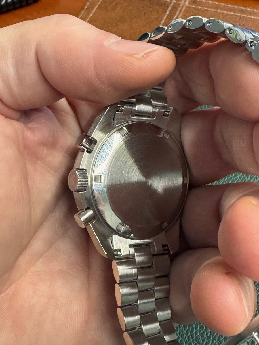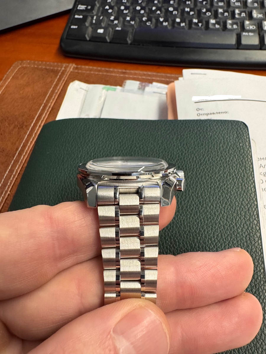 Очередная обновка, мунвоч в расцветке Speedmaster Pilot. Каждая из версий этой модели лежали у меня в корзине и никак не мог решиться. Был в отпуске и увидел у немца сидевшего рядом мувотч от паганцев, и именно это почему то сподвигло к покупке. Начал перебирать дизайны циферблатов и данная расцветка понравилась больше всего. Эдакие мунсвотчи в стали. Ожидал дешевого браслета, но он оказался выше всяких похвал, у SM браслеты острее, тут по большому счету придраться не к чему, особенно учитывая цену. Промежуточные звенья полированные в зеркало это не мастерство мастера, а отдельные звенья, шпильки выкручиваются и закручиваются без проблем. Снял на свое запястье 4 звена, рука 19 см. Циферблат не черный, а скорее серый, все очень гармонично и аккуратно, головка закручивается ровно, кнопки нажимаются с приятным щелчком. При распаковке стрелка хронографа не возвращалась в 0, но это исправилось калибровкой. В общем для всех сомневающихся смело рекомендую. Теперь думаю взять в классической черно-белой расцветке.