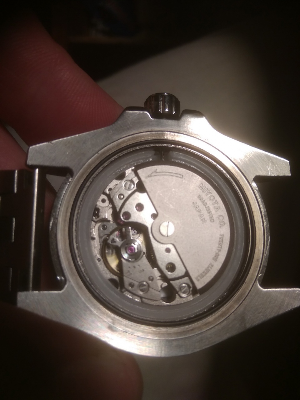 Спасибо всем. Помог двусторонний скоч - липкий, хорошо держит, скатывается в шарик или ручку. Открутил и обрел счастье: внутри оказалась miyota 8215. Настроил +-0.5сек. Посмотрим...