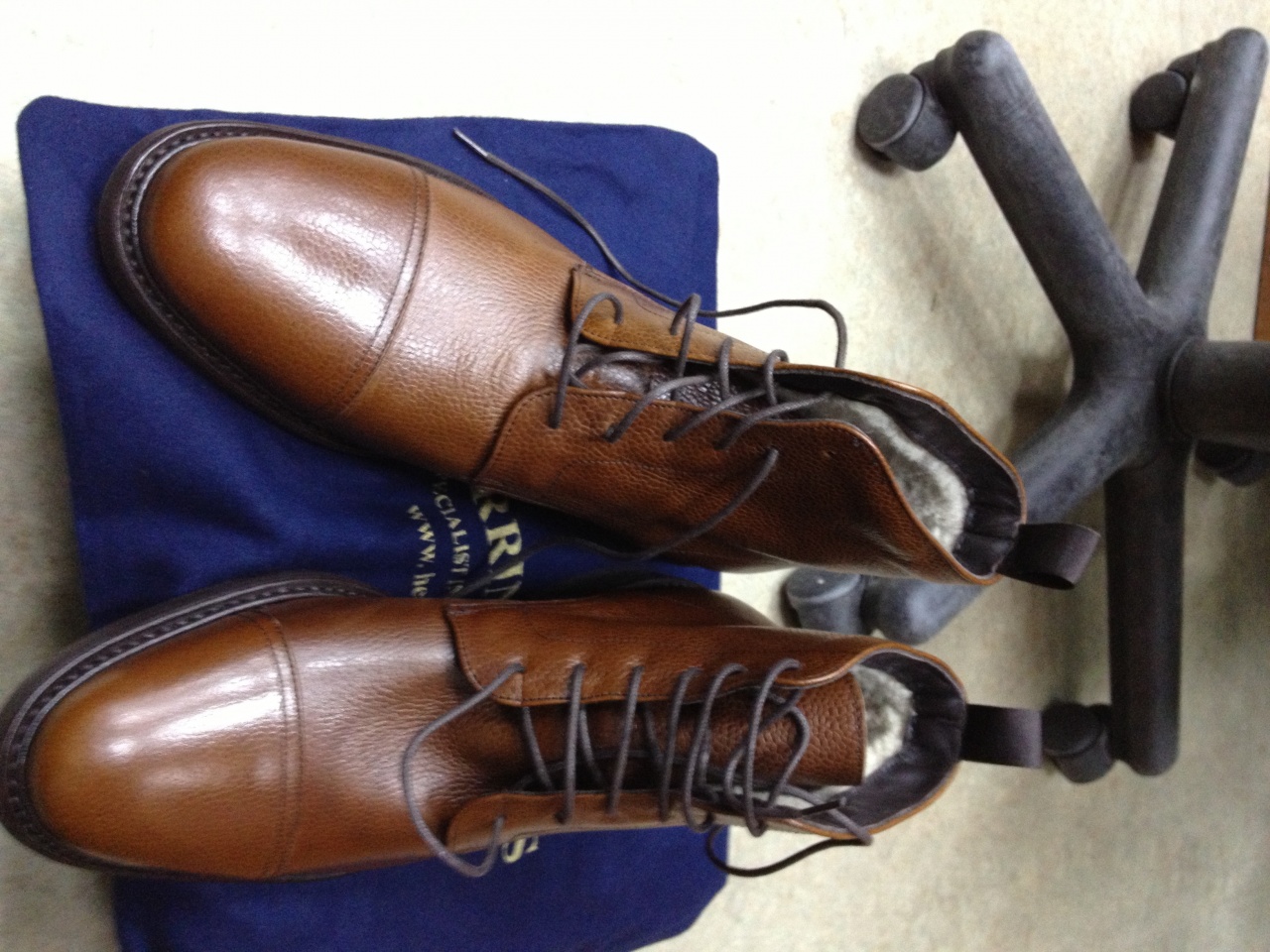 По изготовлению это скорее всего Лоук, у него есть модели из такого же цвета и фактуры кожи в коллекции 1880. Мейд ин ингланд, удобные, в том числе на мою широкую лапу. Мех не длинный, как скрученный, но густой. Цвет конечно не совсем тан, может темный тан ))