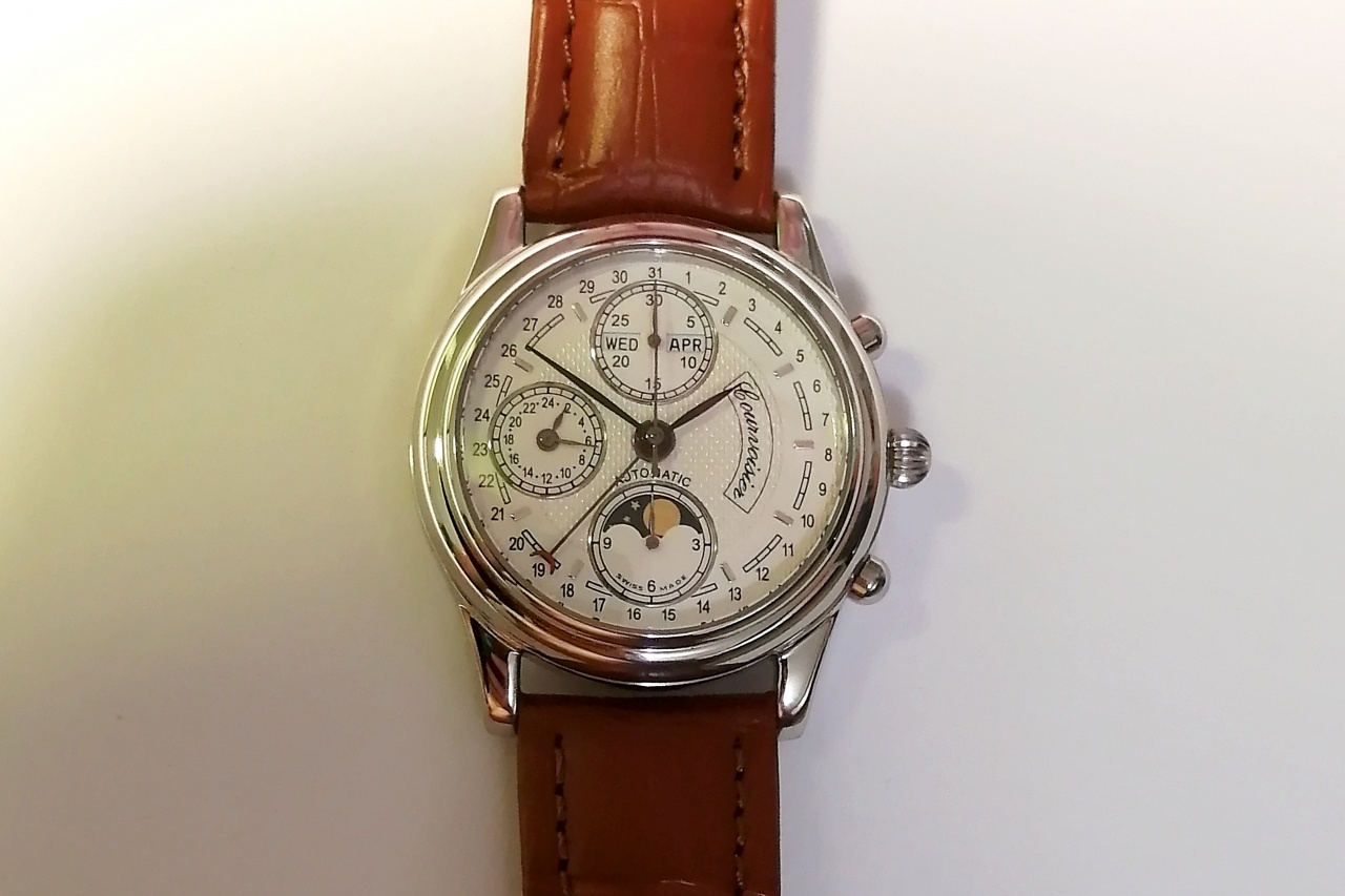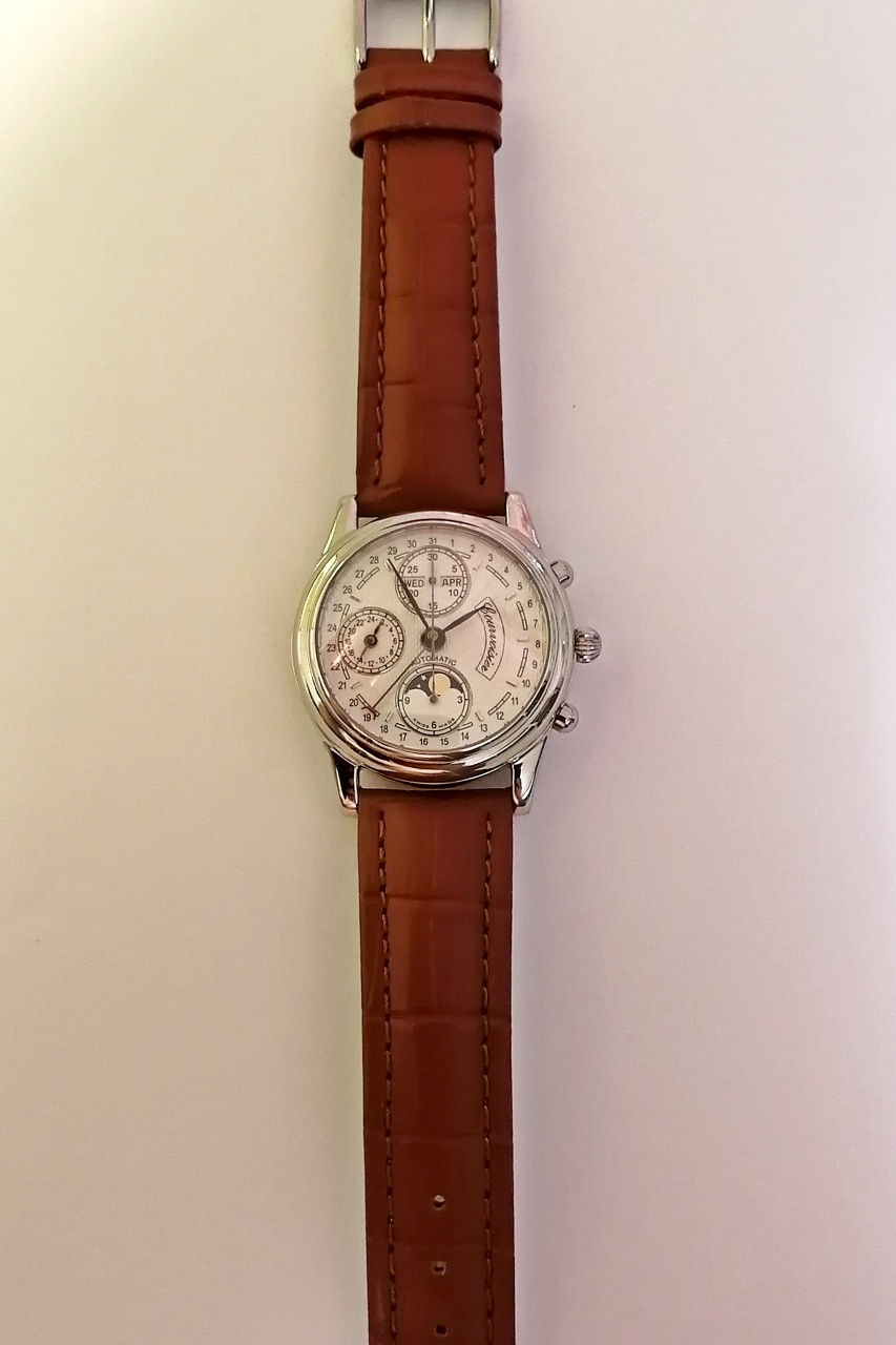 Калибр ЕТА Valjoux 7751 (Секундомер;12/24 часовой формат времени; Дата отображается центральной стрелкой; Индикация дня недели, месяца; Фазы Луны), оригинал Swiss Made.