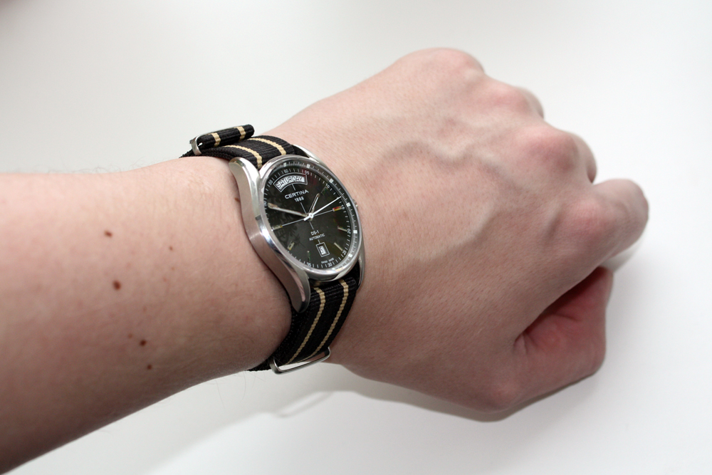 Единственное, что не нравится - это какое-то дурацкое решение Сертины делать на своих часах нестандартное расстояние между ушками. На этой модели 21 мм. А, учитывая, что часы изначально продаются на непрактичном кожаном ремешке, то купив их, обрекаешь себя на муки поиска ему подходящей замены. Подобрать браслет мне пока не удалось, но я нашел выход в нато-ремешках. Пока купил пару штук на 20 мм, хочу попробовать заказать на 22 мм, посмотреть как сядет.