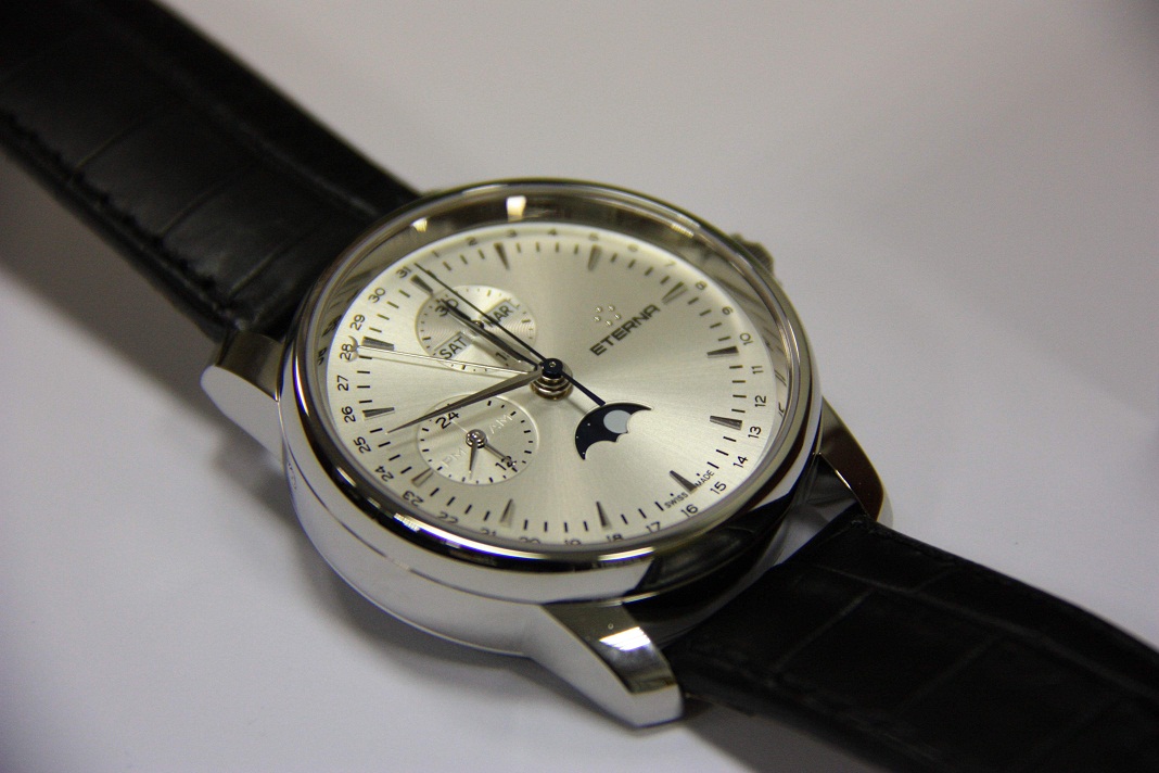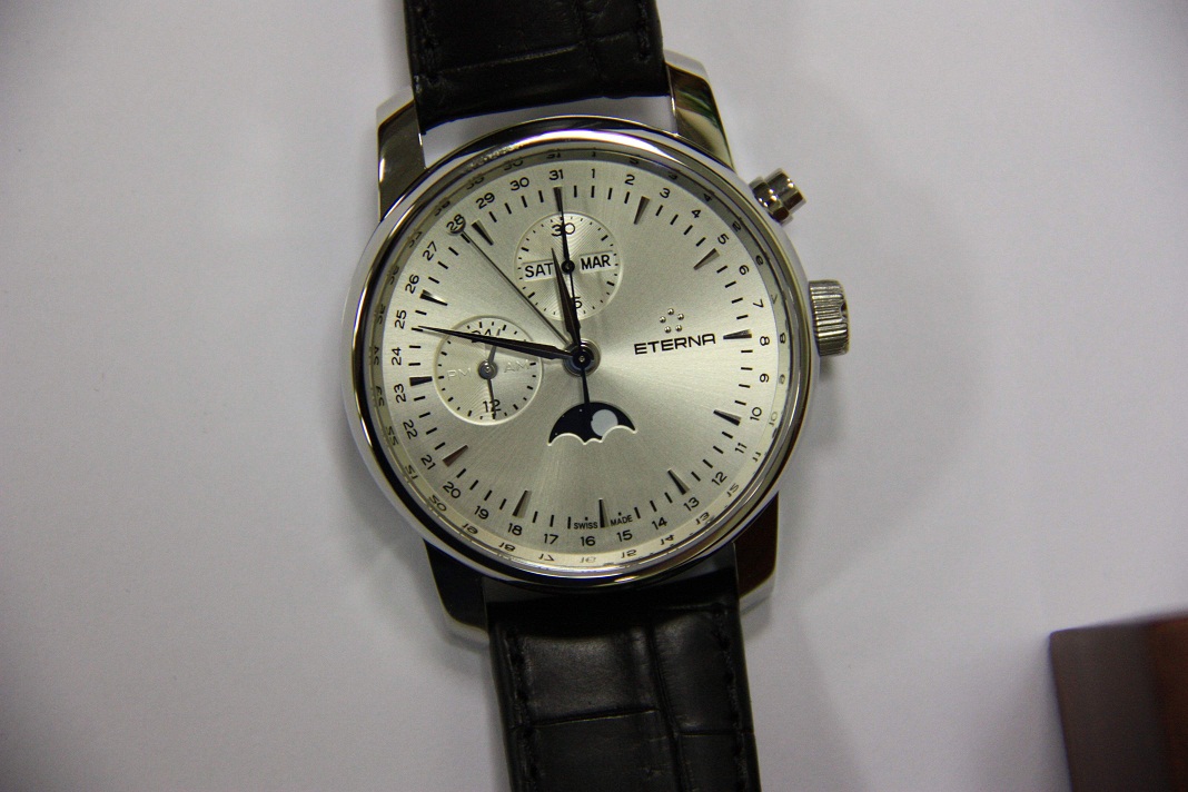 Eterna пополнилась сложной моделью Soleure Moonphase Chronograph Monopusher. К стандартному внушительному набору полного календаря (дата, день недели, месяц), индикатору фазы Луны, времени во втором часовом поясе и хронографу добавилось практичное усложнение разработанное Paul Gerber для базового калибра ETA 7751 подразумевающее управление хронографом при помощи одной кнопки. Новинка представлена в стальном корпусе диаметром 42 мм. Максимальное время работы секундомера составляет 29 часов 59 секунд.