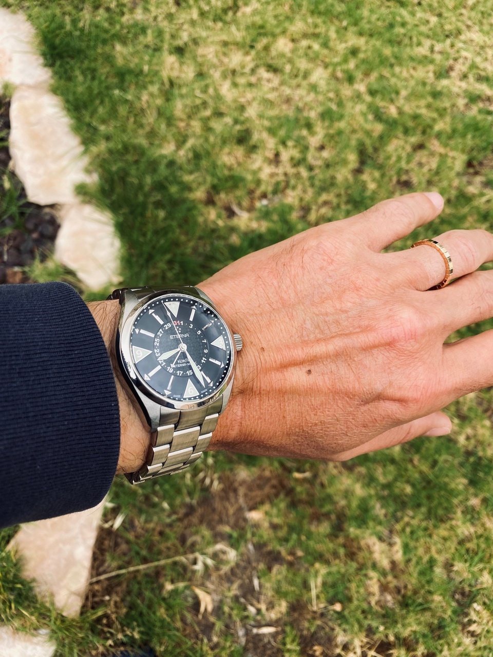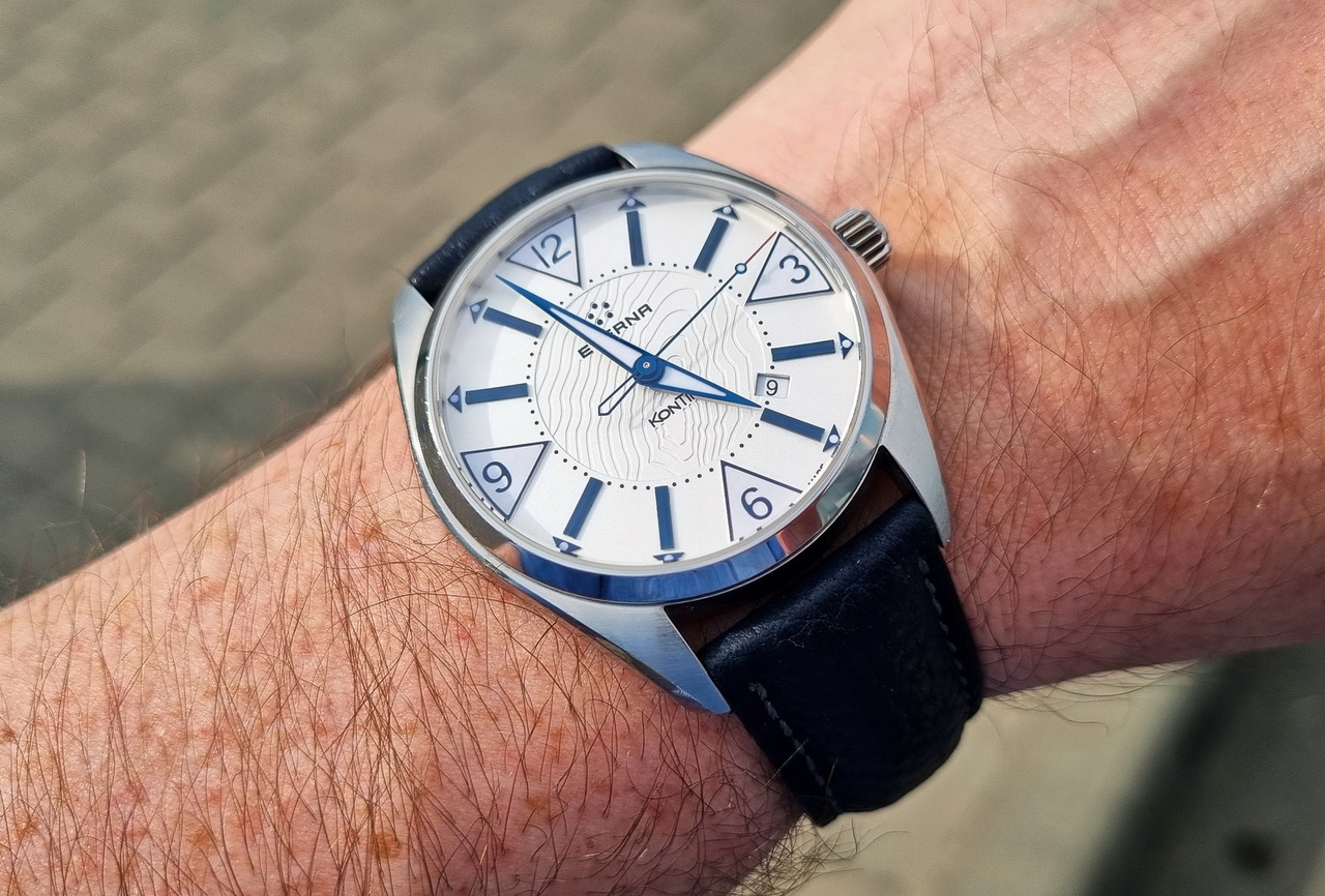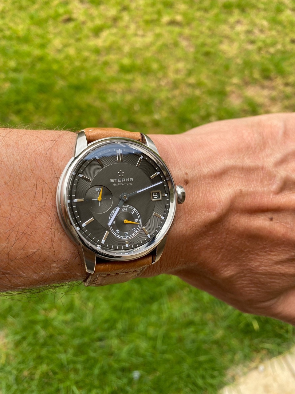 Eterna since 1856. Массивная застежка с логотипом и именем бренда на полированной в зеркало полосе. Магнит для царапок. В застежке устройство для изменения длины (quick adjustment) прямо как инновация и прорыв века у Тюдор в последние года два. В механизме закрытия удлинения керамические шарики. В механизме закрытия самой застежки шарики отсутствуют, сэкономили. Внутренняя обработка застежки приличная, но не премиум. Первичный подгон ремня по размеру руки производится с помощью острого ножа, которым отрезается излишки. Далее, в процессе эксплуатации используется внутренний механизм для удлинения\уменьшения. Насколько я понимаю, ремень не очень-то долговечный и по прошествии пары лет начнёт трескаться. Где покупать фирменную замену пока непонятно, но стандартный размер 22 мм между ушками поможет быстро и без особых затрат поставить любой другой. В целом очень прилично и достойно. Ложка дегтя: в промо-экземплярах новинки застежка была совсем иной и кроме быстрого изменения длины также имелось удлинение для дайверского комбинезона. На рынок же поступили часы с застежкой хорошей, но более дешевой и простой в производстве\исполнении.