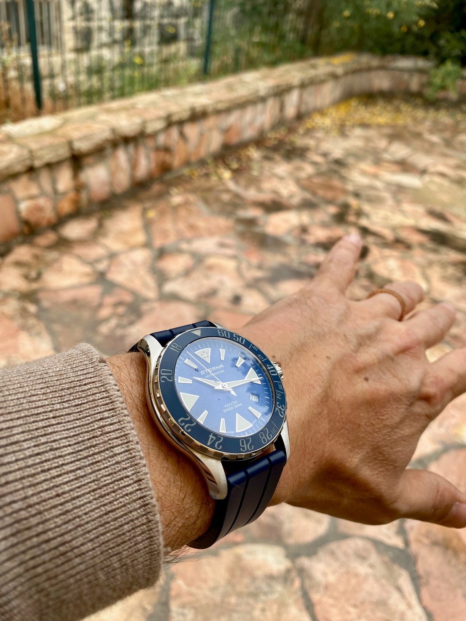 Привет преданным любителям и любопытствующим! Бегло пролистав страницы, не нашел какого-либо отзыва о новинке 2018 года KonTiki Diver 200m. Только фотографии. Попробую восполнить, строго не судите. У меня вариант с синим циферблатом на синем резиновом браслете. Случайная спонтанная покупка в магазине, что сливал неликвид по приемлемой (для меня) цене. Часы пролежали в магазине года три-четыре, полностью в пленках, даже не витринный вариант. Для меня было важно пощупать перед покупкой знакомую только по фотографиям модель и хорошенько осмотреть. Дополнительный плюс в беспроблемном возврате и двухгодичной гарантии приличного магазина. Насколько я могу судить, это последние новые Кон-Тики проданные в Израиле. Часы на мой взгляд достаточно красивы, несмотря на размер в 44 миллиметра не чувствуются огромными, за счет небольшой толщины 12.2 миллиметра сидят на руке очень удобно. Не тяжелые.