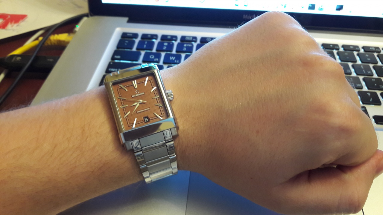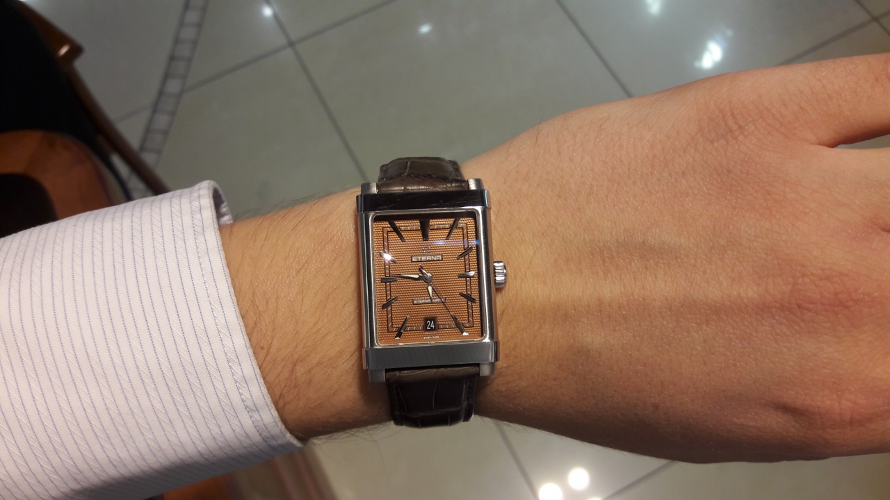 Недавно купил себе Eterna 1935 Eterna-Matic Grande Men's Brown. В теме посмотрел — такие тут непопулярны, только у кого-то один пост был. Часы просто восхитительны! Я даже не думал. У меня всегда были только круглые часы, и прямоугольный циферблат никогда мне не нравился, но померяв эти — что-то случилось. Они просто запали в душу. Сейчас я просто не могу насмотреться на них. Не знаю, как на фото, но в жизни выглядят очень нарядно. Обращают на себя внимание, но в то же время лаконичны и не вычурны. Если раньше мои другие часы были на большую часть времени с руки вытеснены Панераями (359), то сейчас хожу в этих и просто тащусь. В общем, делюсь радостью. Фото в приложении (купил себе на браслете и ремешок дополнительно).