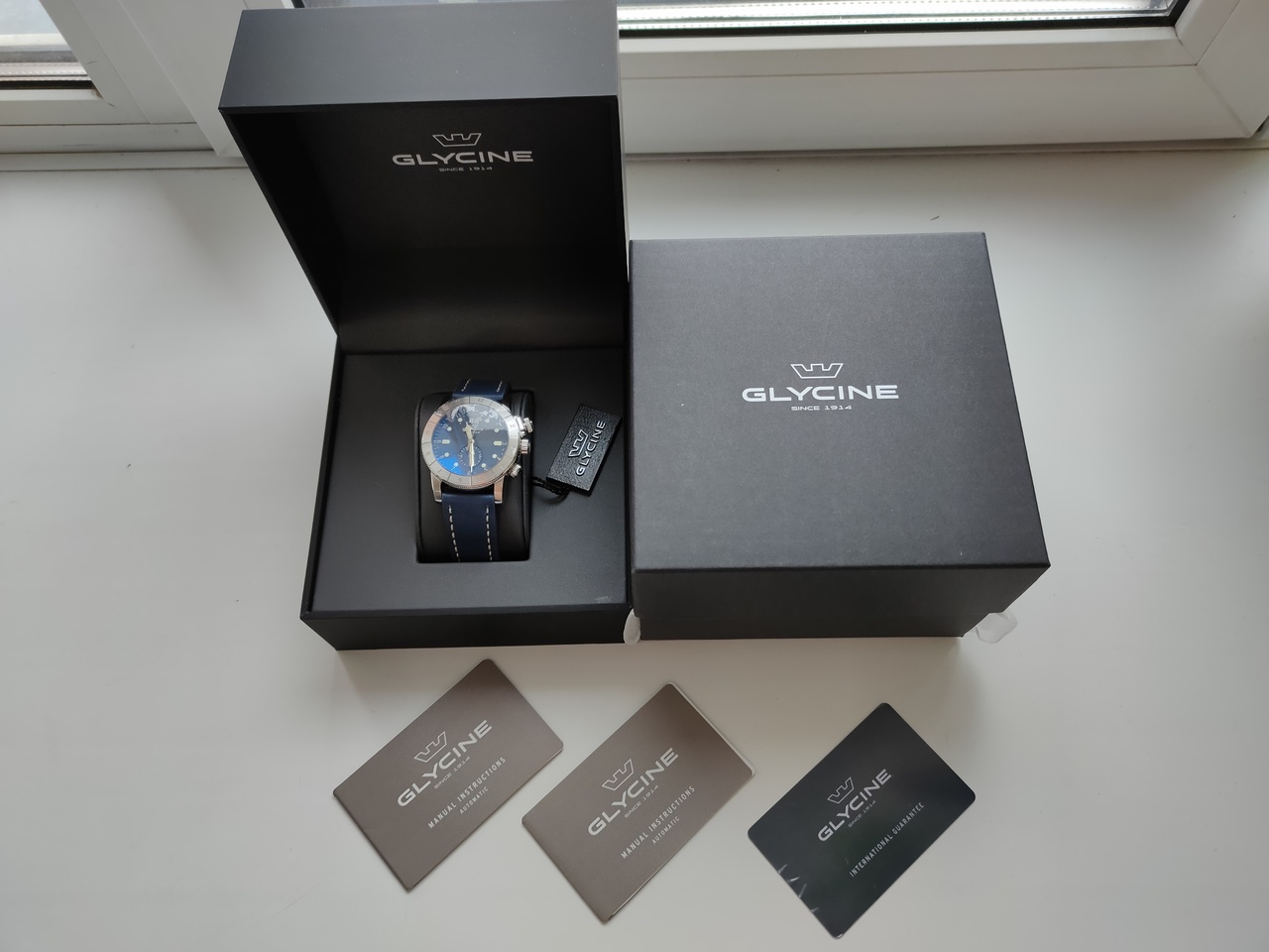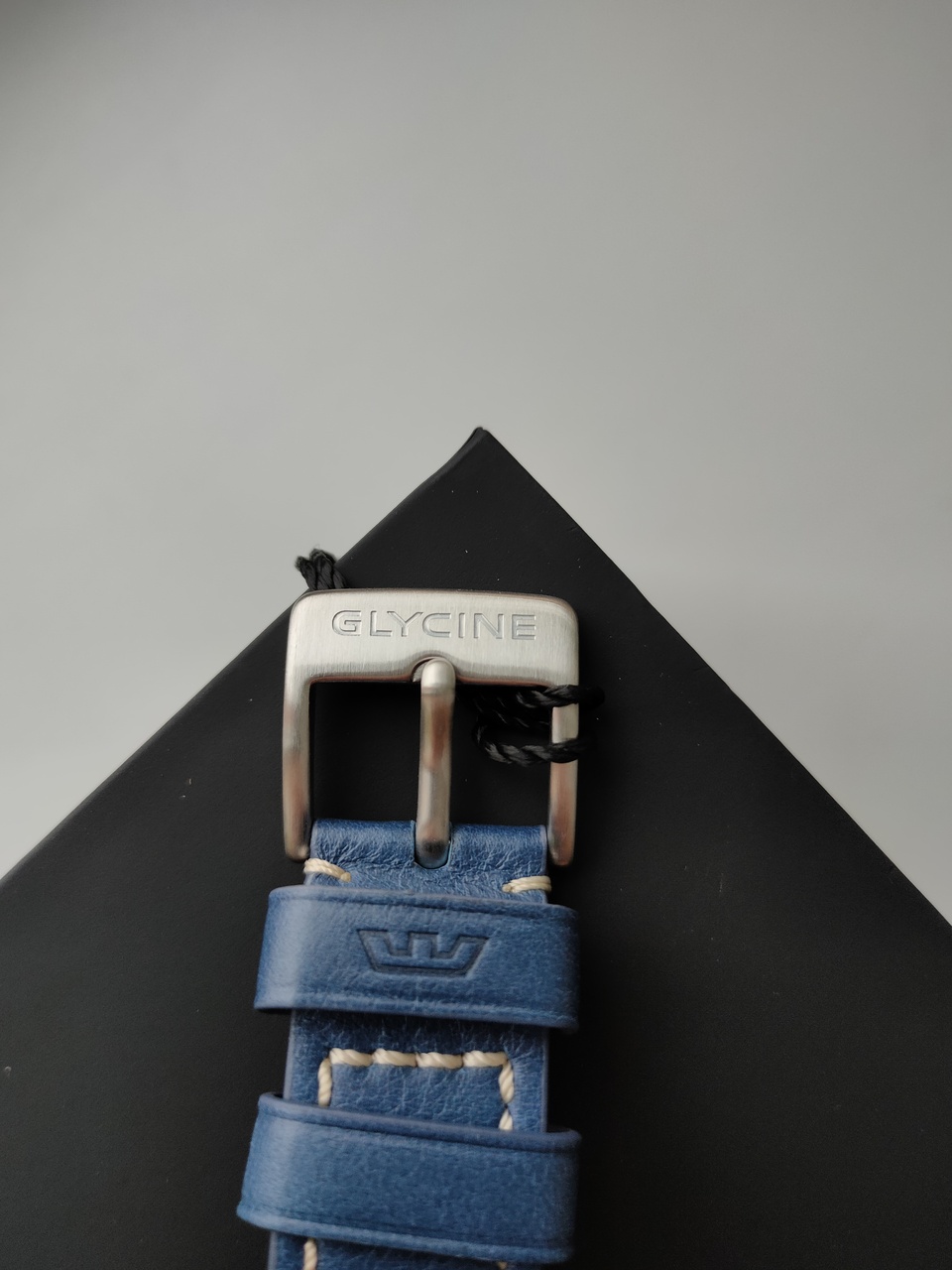 Glycine постарались на славу: глубокий насыщенный синий цвет цифера в сочетании с синим ремнем смотрятся очень круто. Поворотный безель, фиксируемый отдельной заводной головкой привносит что-то не банальное в дизайн. Отдельного внимания заслуживает шикарная гравировка самолета на задней крышке