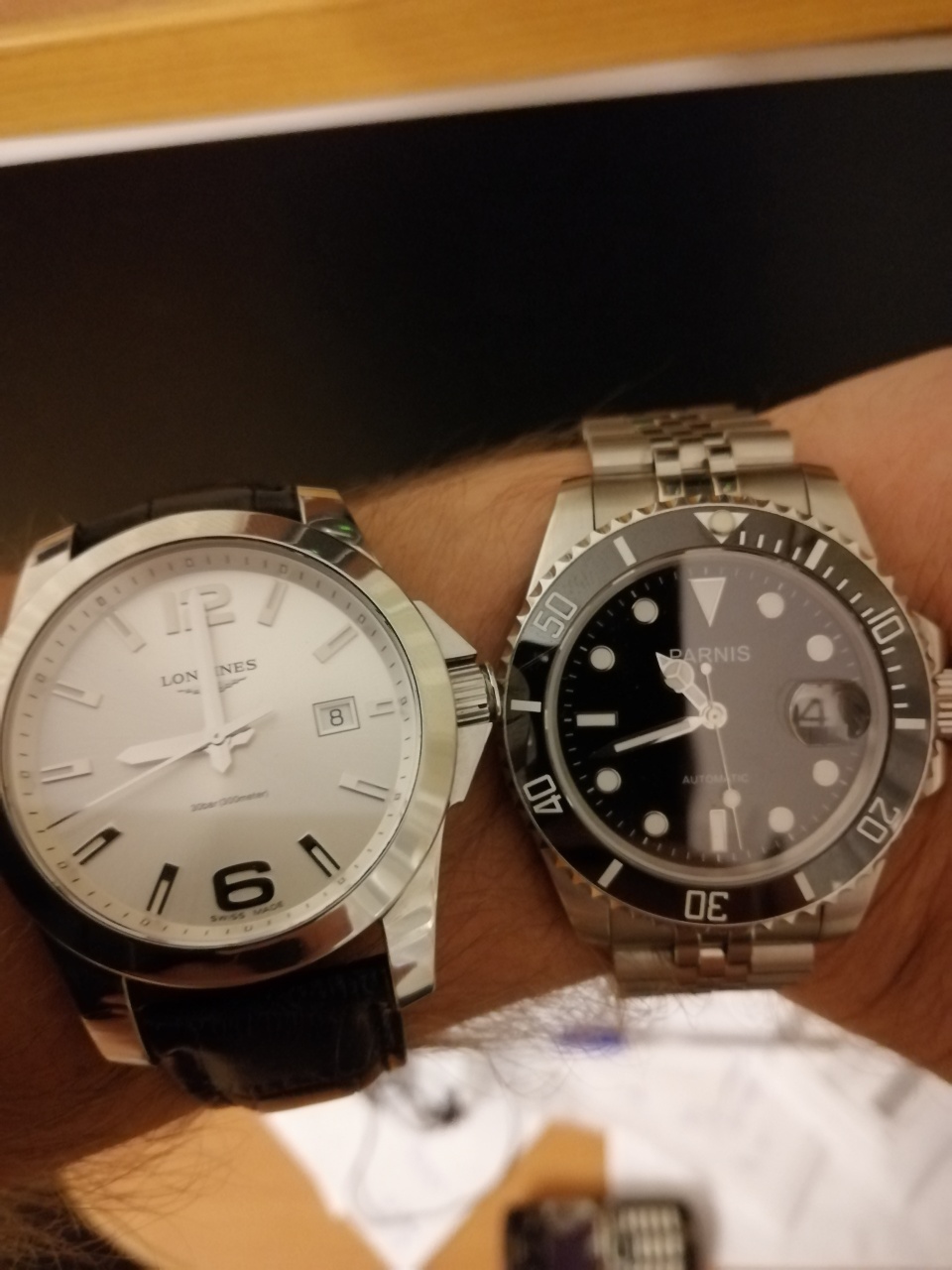 Впечатления оставили неоднозначные. В целом-часы вроде оказались сделаны неплохо, под лупой я их не рассматривал, а так никакие косяки в глаза не лезут. На руке смотрятся хорошо, особенно издалека. Так как формат распространенный-подделку под ролекс в них никто не заподозрит (Ролекс у меня тоже никто не заподозрит). Часы увесистые, безель щелкает хорошо. Не знаю, может дело привычки, или особенности формата, но часы не очень хорошо читаемые. И циферблат для их размера небольшой. Дата видна не очень хорошо и только под прямым углом. Чтобы посмотреть дату надо целенаправленно смотреть, мазнуть взглядом не получится. С другой стороны-не так уж часто она и нужна. Браслет после подгонки ничего не цепляет, никуда не врезается. Но выглядит по сравнению с часами дешевым. Вроде придраться не к чему, а вот ощущения "вещи" нет. Он какой то легкий и с увесистыми часами происходит какой-то дисбаланс-непривычные ощущения на руке (наверно со временем привыкну). Через полчаса ношения-выпал штифт, часы с руки полетели на гранитный пол. Проявив несвойственную мне ловкость, поймал в десяти сантиметрах от пола, еще минут двадцать искал штифт. Браслет неспортивный человек сможет застегнуть на бицепсе, укорачивать пришлось много, на тонкую руку можно и не подогнать.