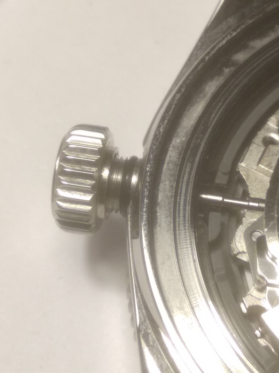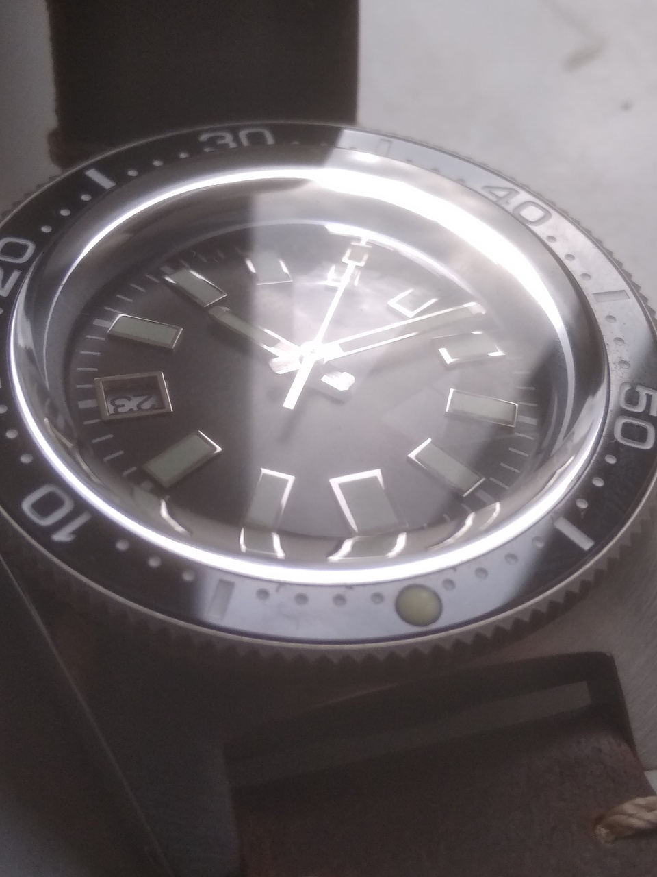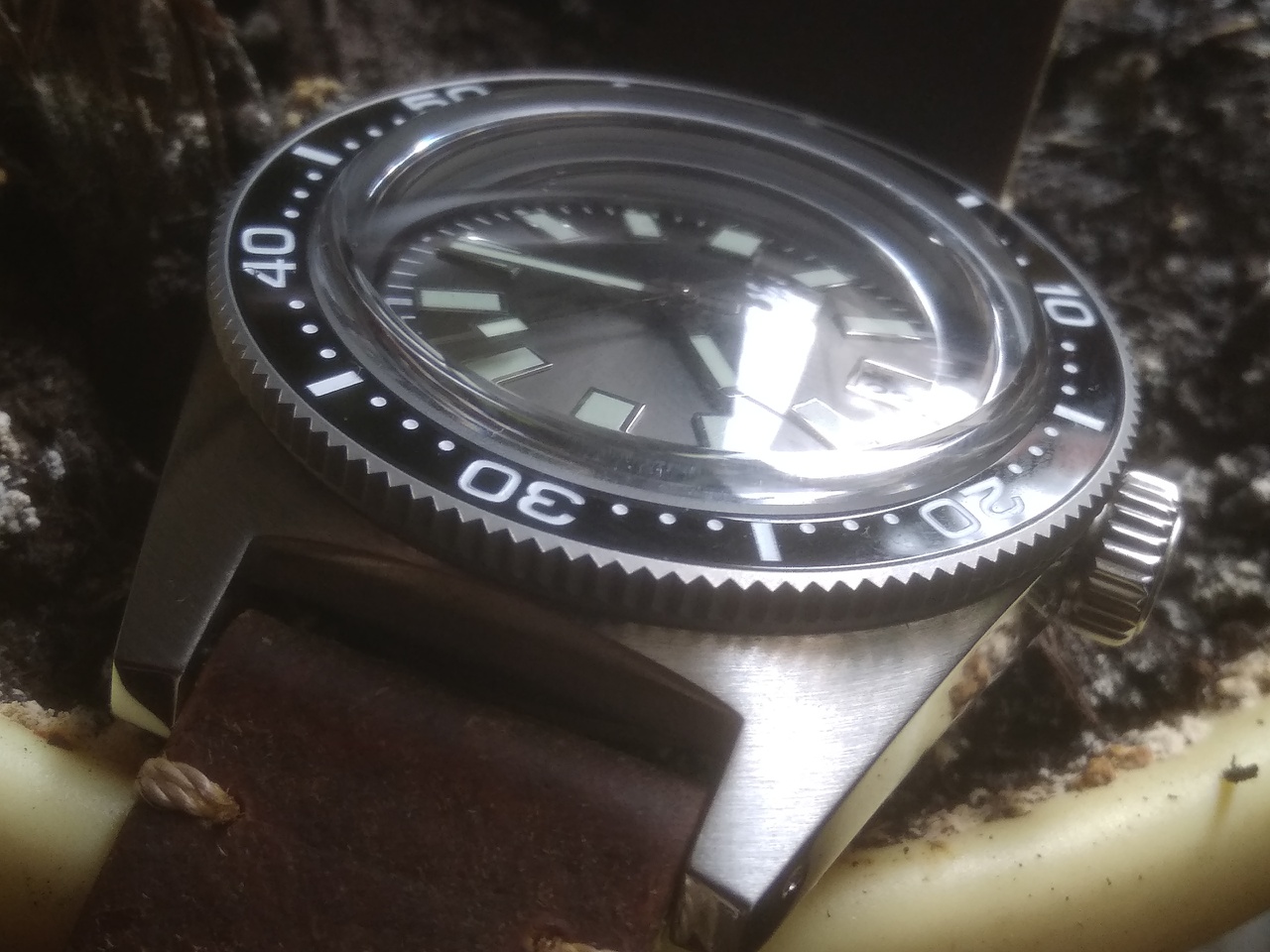 Взял со стерильным цифером, хотя лого там более или менее приличный. Основной минус – отсутствие антиблика. Стоит толстенный выпуклый сапфир (проверено прибором). Не стекло, а почти линза. За счет этого часы кажутся слепыми – масса бликов и игры света, хотя игра света в самом сапфире привлекает внимание светлыми окружностями внутри сапфира. Индексы стоят ровно и светомасса залита аккуратно. Безель с керамическим инсертом и стоит мертво: четкое вращение, ни намека на люфт и бэкплей. Люм только на метке. Цифер санберст серый – очень приятный цвет, специально взял такой. Между ушами корпус обработан лучше обычного – его полировали. Следы вырубки еле видно под углом. Со стороны крышки на выточке под браслет между ушами отчетливо видно следы инструмента. Голова на резьбе, футор длинный и с сальником. Резьба на крышке больше обычного, на самой крышке имеется гравировка Большой волны. Корпус по бокам зеркальный, сверху брашированный. На переходе верхняя-боковая поверхности зеркальной фаски нет, как на аналогичном SEESTERNе целиком брашированном. Люм хороший – суперлюминова, но только на стрелках и на метке безеля. На индексах люм не похож на обычный китайский, который светит ярко первые 5 мин, а потом тухнет навсегда. Этот люм светит еле-еле, тускло, сколько его не засвечивай, но долго, так же, как и на стрелках. Похоже на сильно разбодяженную люминову