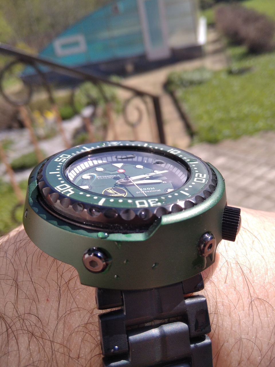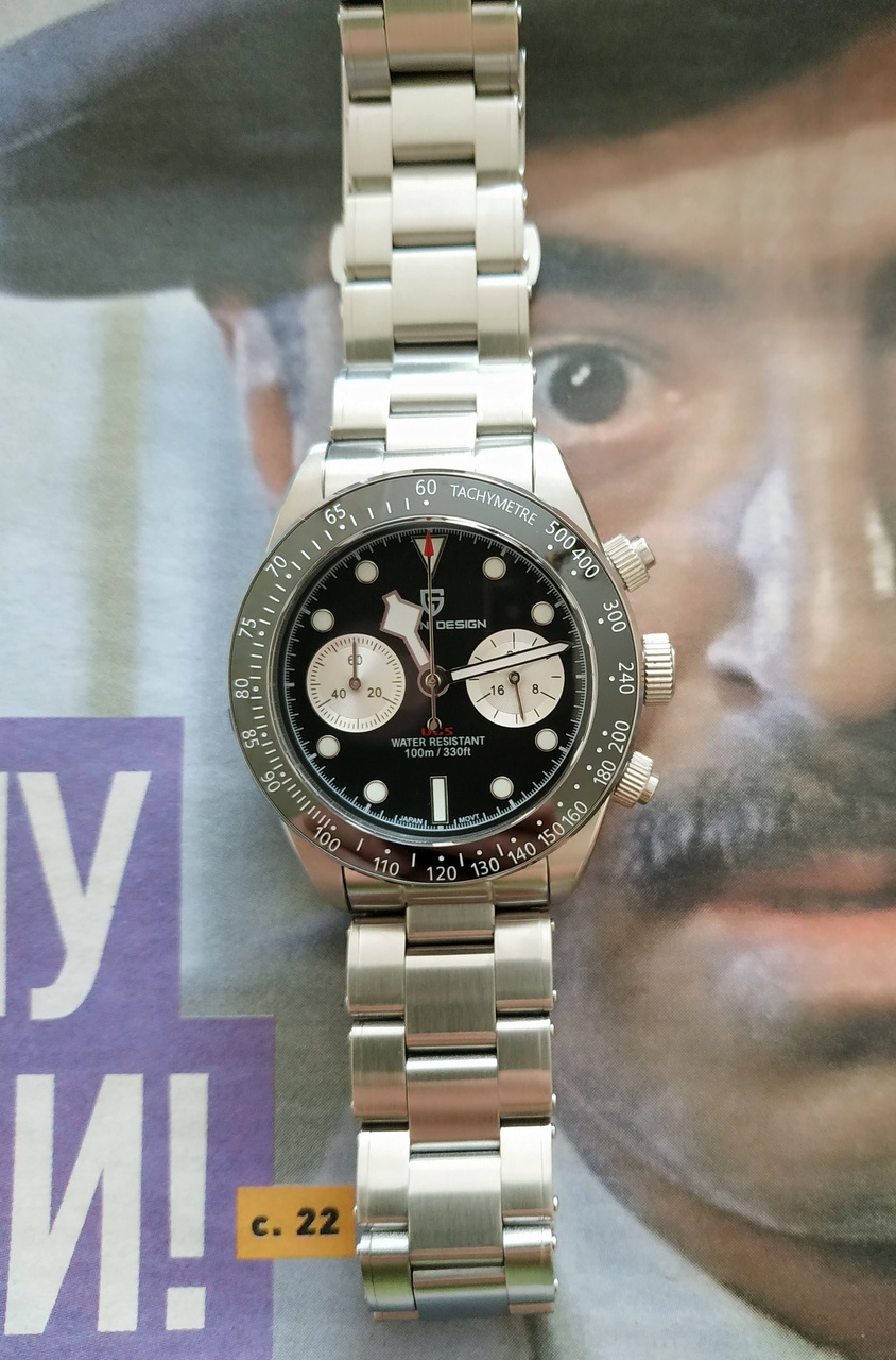 Приехали, наконец, Pagani BB. Браслет монументальный, железа много, но, боюсь, винты со временем будут раскручиваться. Хрон такой же, как на PD-1711, что ранее обсуждались здесь. Т.е., секунды нет совсем, лишь при включенном хроне. Чё-то выпуклое стекло не впечатлило, лучше б плоское было. Наверное, теперь буду думать о PD-1711. Радует, что нету календаря.
