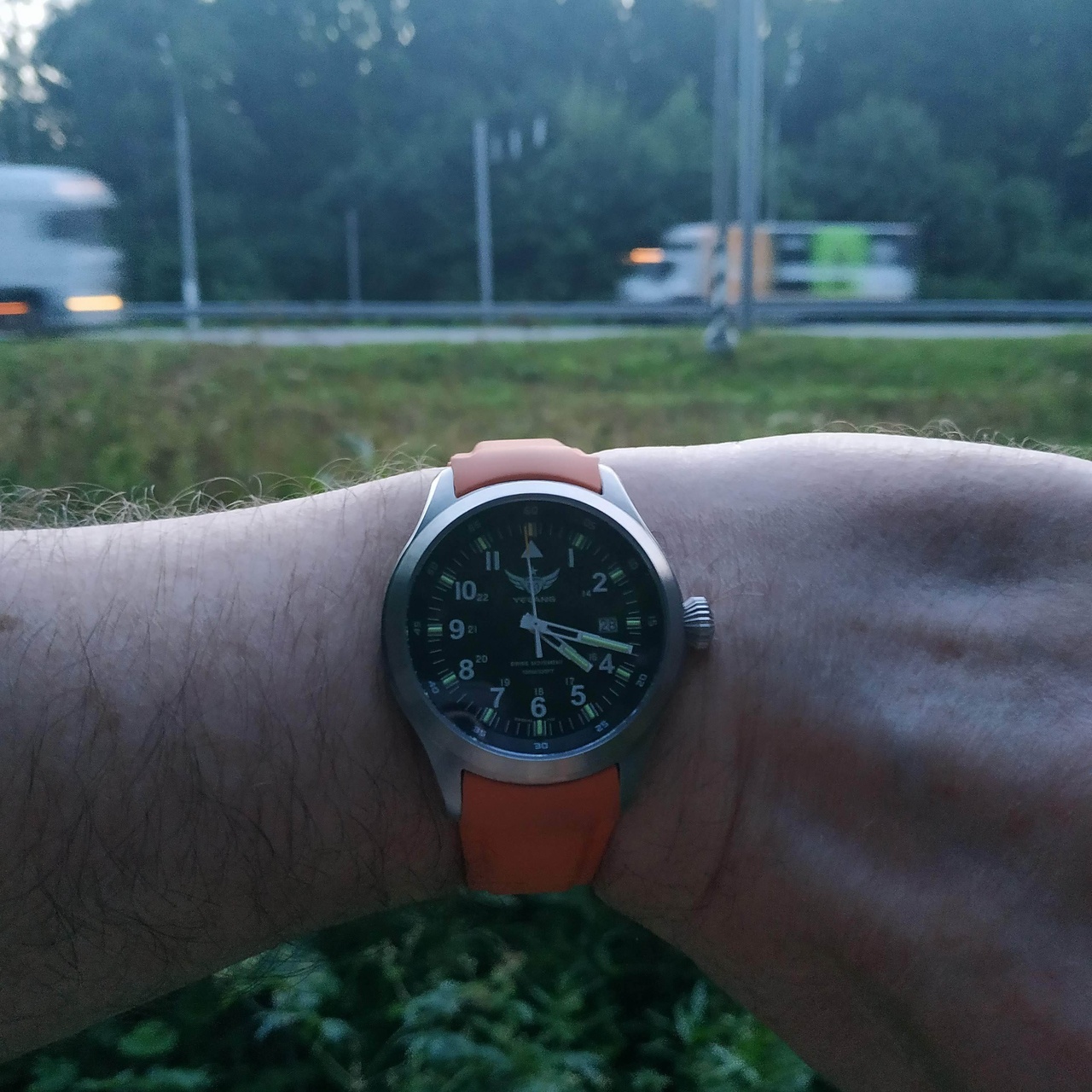 • Светомасса. То, что на стрелках и на циферблате она разной яркости — полбеды. Люминова от метки к метке светит по-разному, и когда ты с солнца ныряешь в тень, часы смотрят на тебя вот так О_о. Через пару секунд особо яркие метки притухают, картинка практически выравнивается, но первое впечатление — "Ээээ, это чё?"