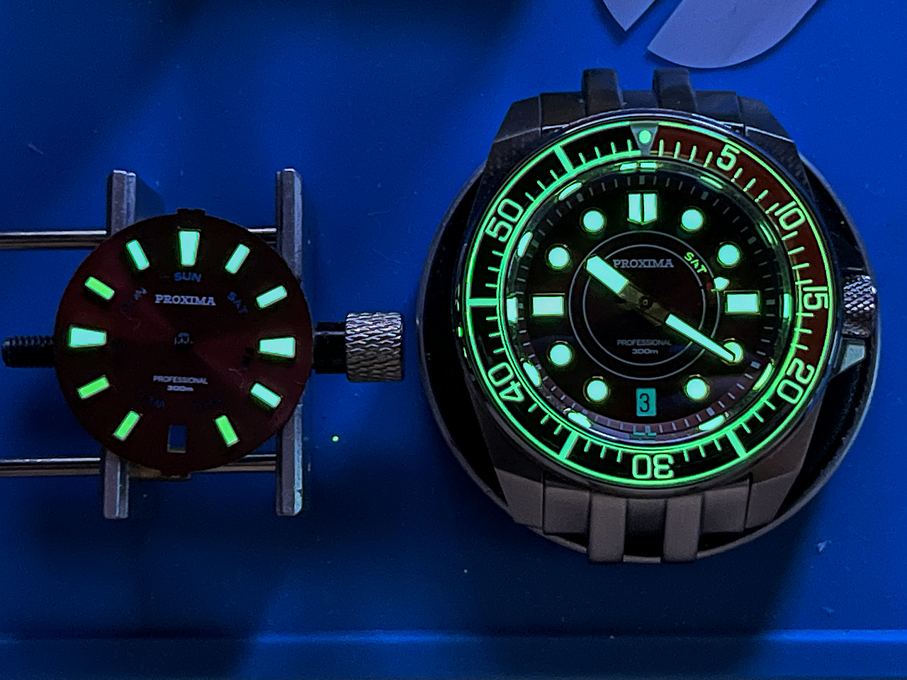 Но фото оттенки люма цифера и стрелок отличаются от оттенка люма на безеле , в реале же оттенки зеленого идентичны .