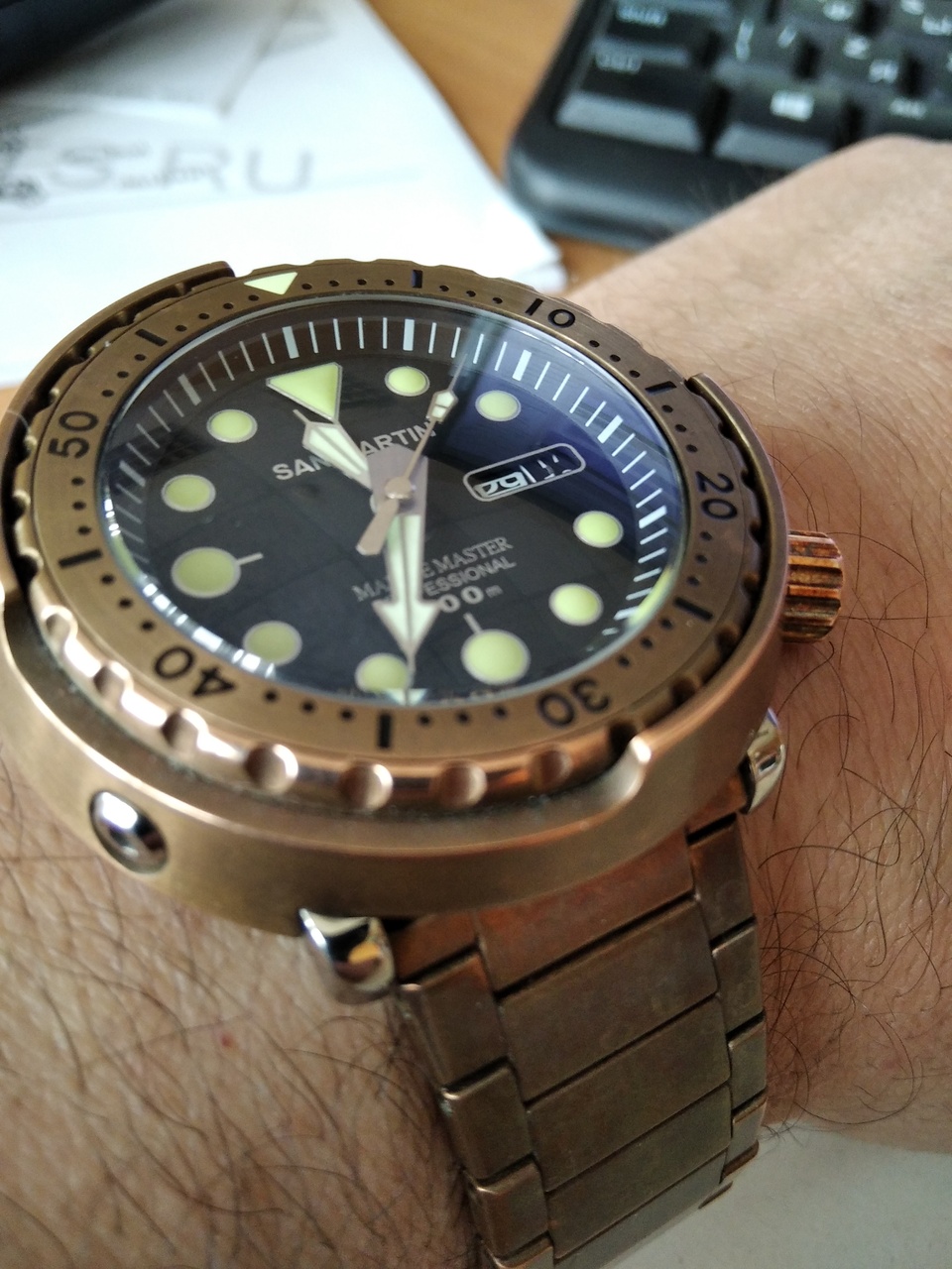 Разве это так работает? Пятна на запястье в 1-2 см от часов и бакли - при загибе ладони кожа касается боковых поверхностей и окрашивается в сине-зелёный цвет...как-бы ни была интересна бронза, пока вывод, что все-таки не для лета и потных рук. Опять же есть подозрение, что часы на руке от пота теряют патину и светлеют, ну и равномерность этой патины под вопросом, а в случае крупных часов и браслета - вес. Не вижу эстетически бронзу иначе как на кожаном ремне коричневого цвета.