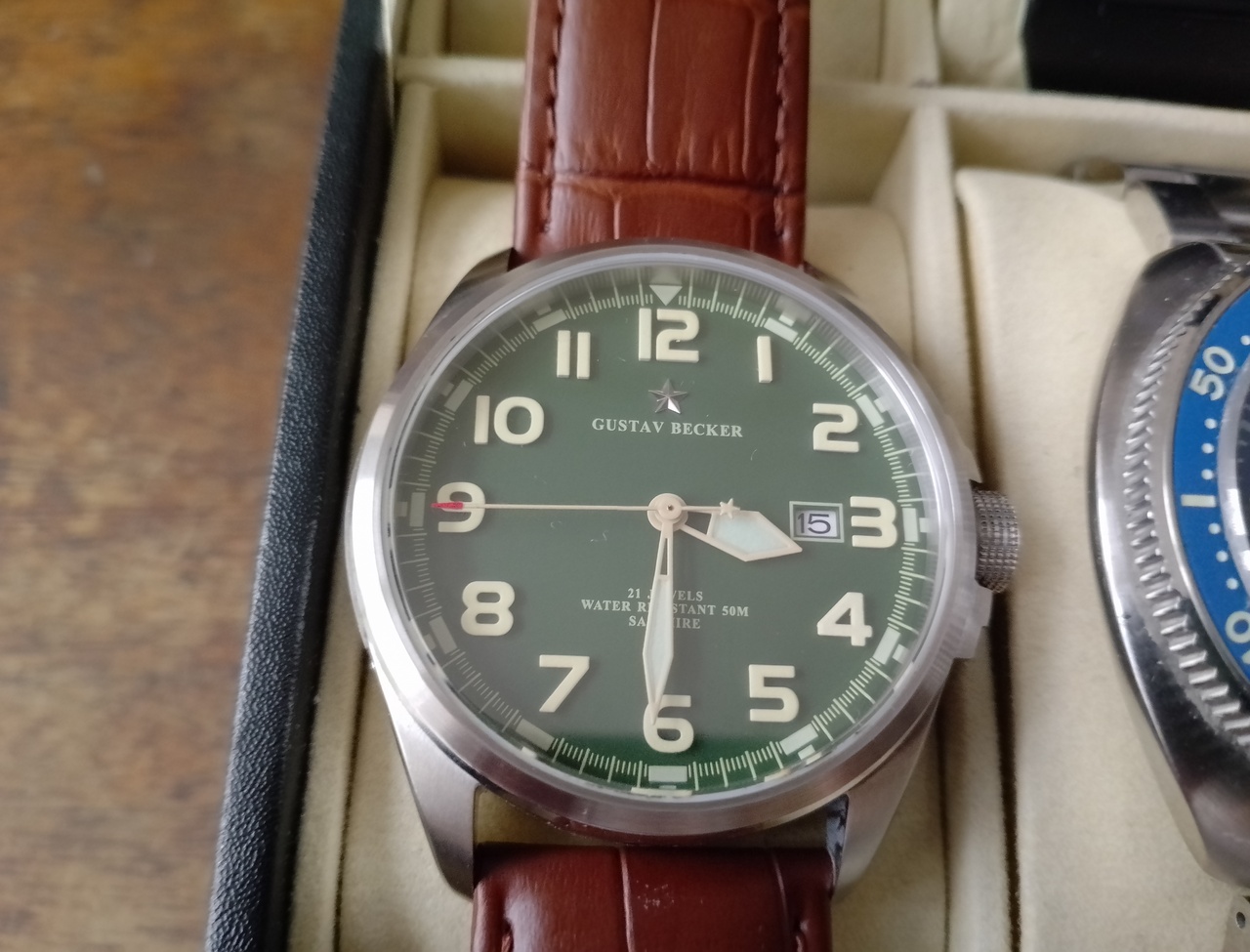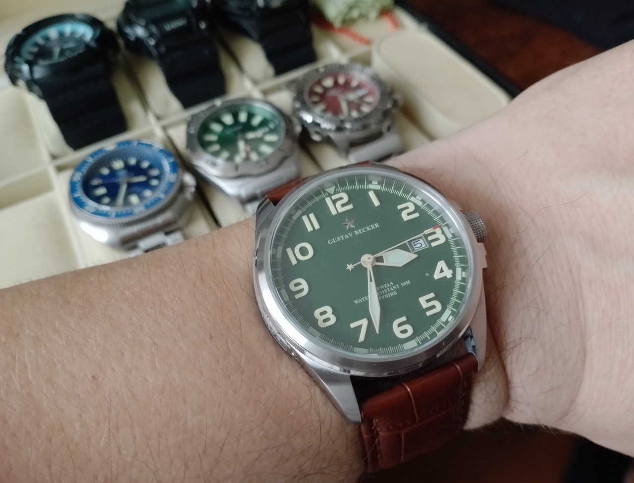 Всё ж-таки, вынужден согласиться с тем, что Густав не смотрится на браслете, попробовал два разных браслета, не зашло, пересадил на кожаный ремешок, получилось очень хорошо, аккуратно и благородно. Правильно говорили, что такие часы смотрятся исключительно на ремешке.