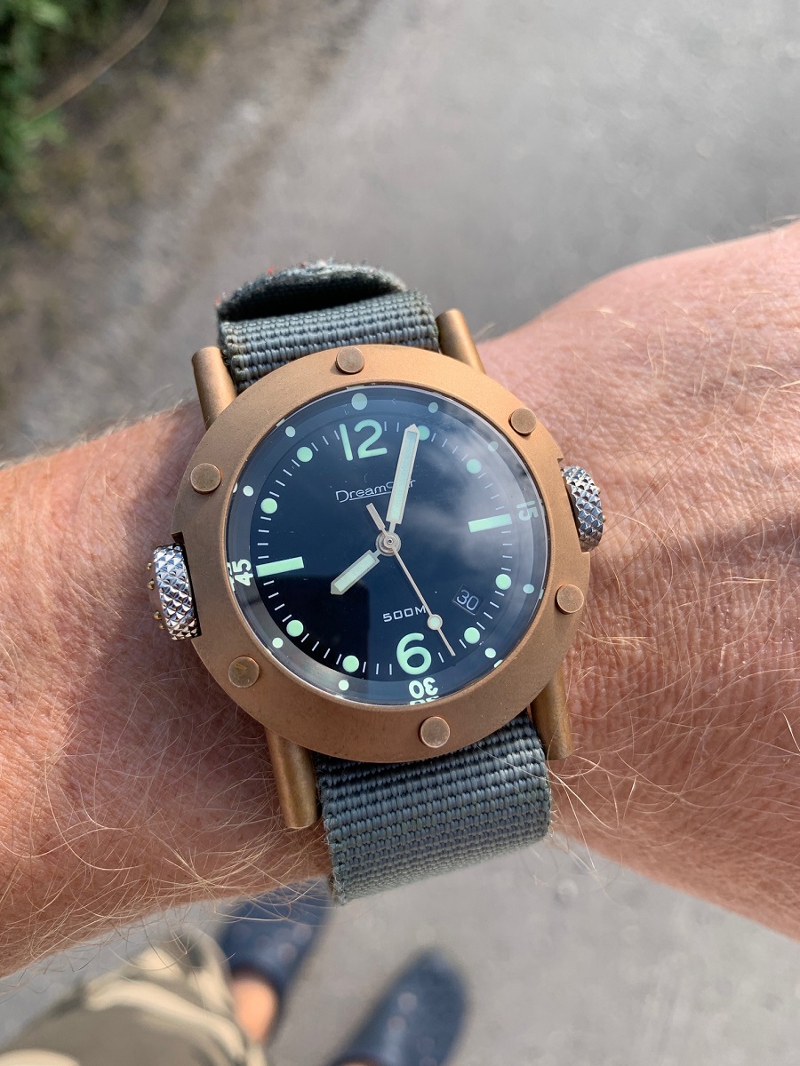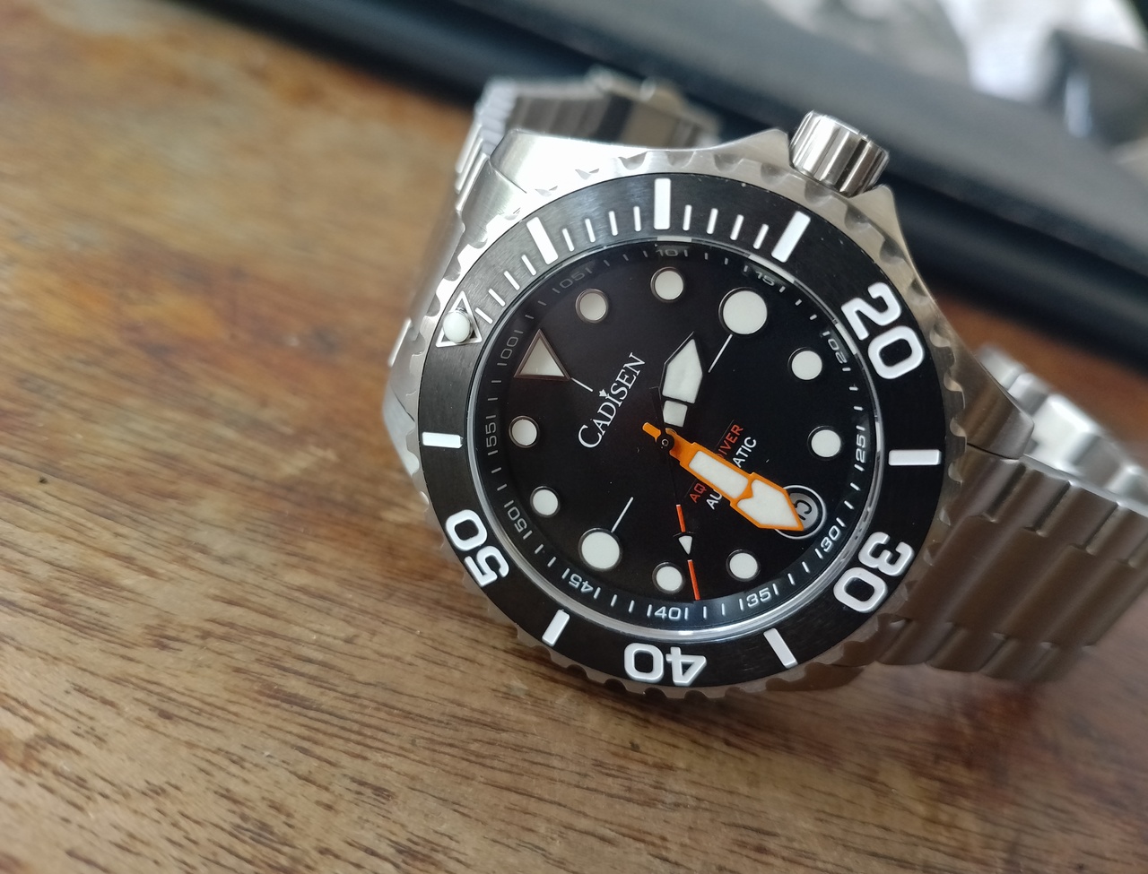 Привет часоголикам! Приехали ко мне мои Cadisen AquaDiver (homage Helm Komodo). За цену 5789 р., что они мне обошлись, считаю, что часы - прелесть. Стекло - сапфир, водо-защита 100м, нержавейка, безель односторонний (чуть люфтит, крутится очень легко со щелчками в одну сторону), браслет удобный, длинный (пойдёт на любую руку, снял пару звеньев), заводная головка большая, ухватистая, удобная, завинчивается долго на несколько витков (оборота 4). За эту цену нет претензий, если бы стоили чуть дороже, наверное, придрался бы к люму, он довольно хреноватый, синего цвета, в остальном от часов только положительные эмоции. Точность хода замерил - +20сек - что для меня не критично (хорошо, что спешат, если бы отставали, тогда бы было хуже). Сразу хочу сказать, часы маленькие 40мм, на моей медвежьей лапе в 19,5см смотрятся довольно маленькими, я привык носить 43-45-48мм; 40мм, конечно, маловаты, но для среднего и маленького запясться будут в самый раз. Интересное расположение окошка даты на 6-ти часах мне понравилось, у меня раньше таких не было, все часы - дата на 3-х часах. Очень неплохие часики с довольно оригинальным дизайном (хоть и хомаж на Хелм Комодо) на лето, да и не только - прелесть, под рубашку и под рукав отлично прячутся.