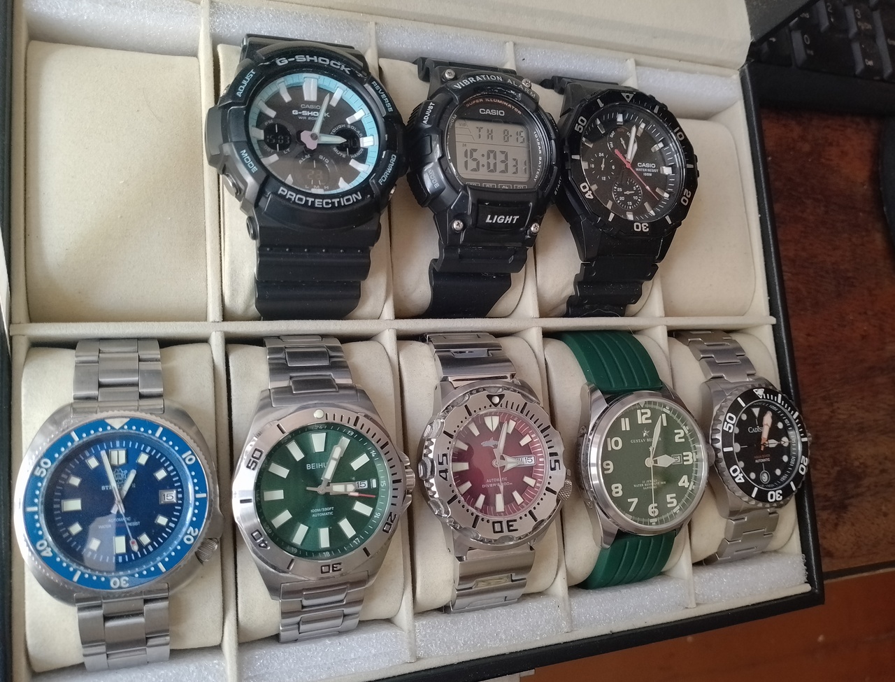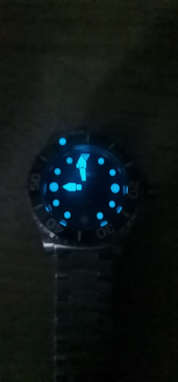 К сожалению, люм красивый лишь на фото, по факту - его, считай, нет, потому не стал и выкладывать фото с ним. Но когда я заказывал, я об этом знал, такое же г... на адиесдайвах используется в синем варианте, на фото у продавца было уже по фото понятно, что нормального люма нет, всё, что не C3 - не светится нормально. Но цена уж больно по акции вкусная была, да и часы, в целом, отличные, аккуратные такие часики. Кстати, первый день из коробки шли +20сек, спустя насколько дней идут -1сек -::- +5 сек, наверное, расходились. Ношу не снимая несколько дней - очень удобная посадка, удобная коронка, удобный безель, хорошо обработанный браслет, жалко люма недоложили :-)