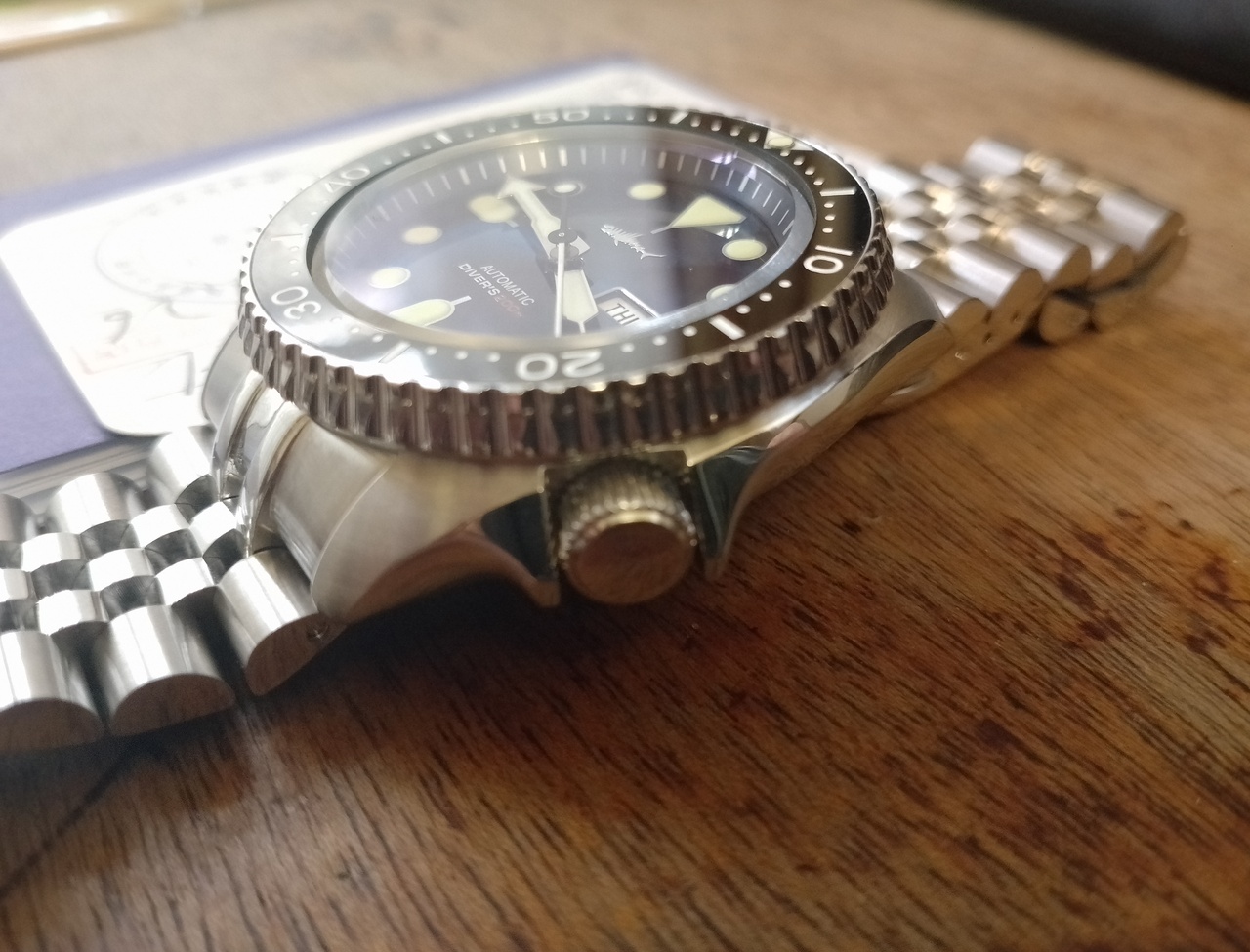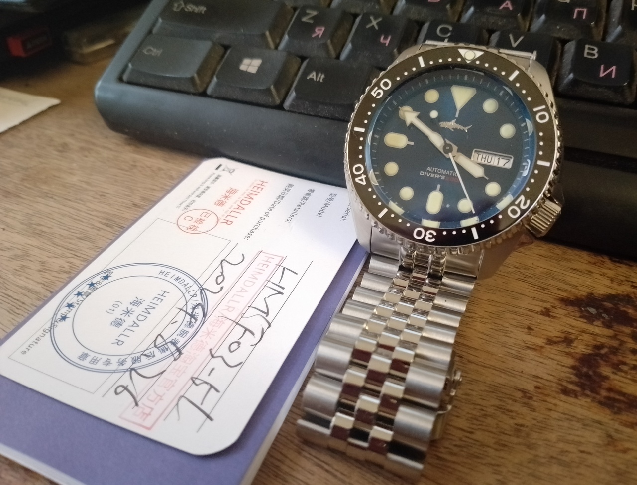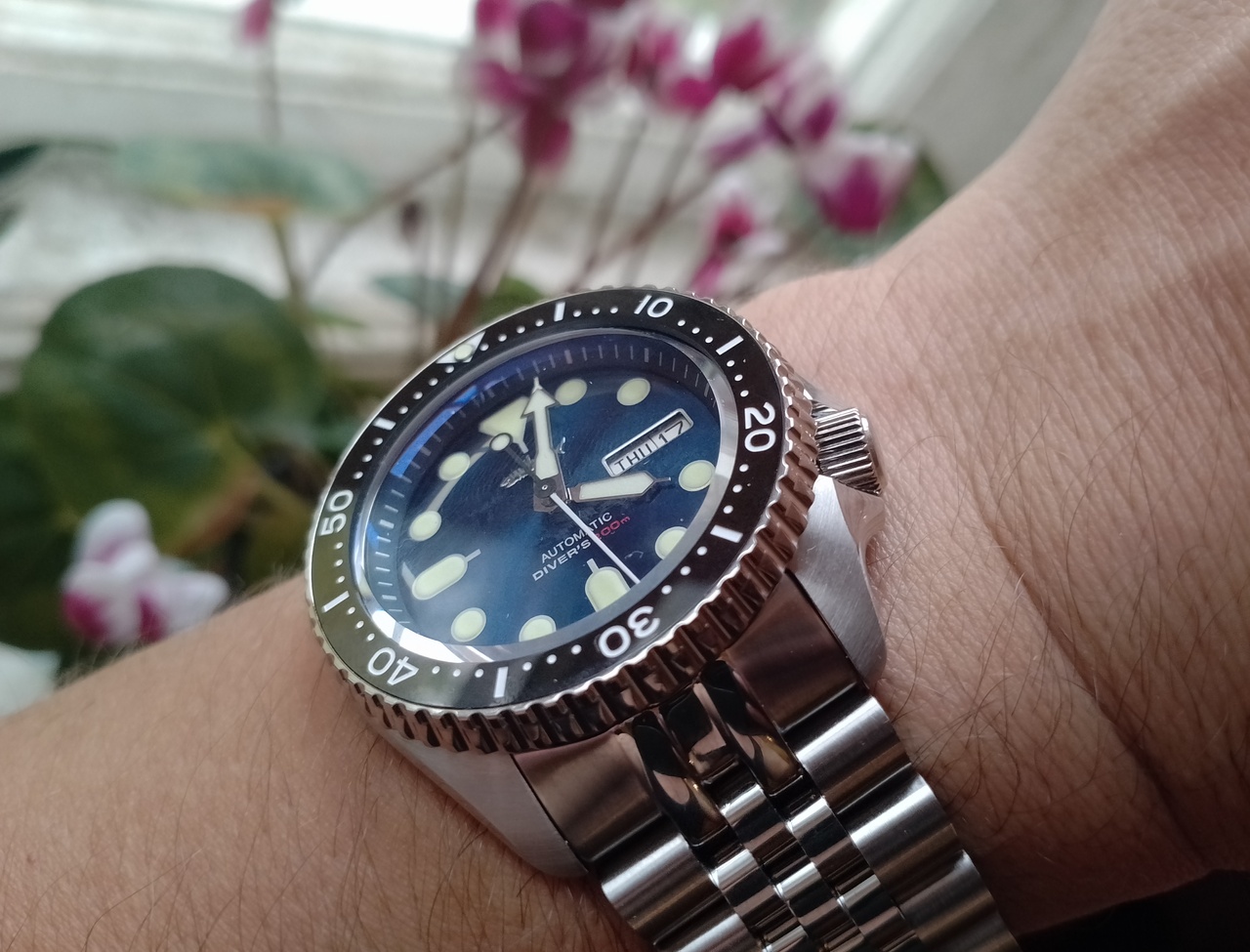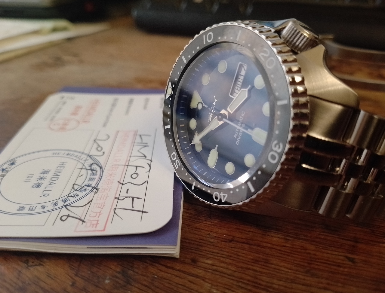 Приехали ко мне часики, хомаж на Seiko SKX007 от HeimDallr. Очень понравились, как и ожидалось - качество на высоте, заказал опять от HeimDallr, потому что у меня уже есть часы от этого китайского бренда (хомаж на Seiko Monstr v3 в бардово-рубиновом варианте). Исполнение очень понравилось, качество отличное, цвет циферблата - это просто нечно неописуемое, на фотографиях у продавца он смотрится как чёрный, хотя заявлен как синий, на самом деле, в живую, он почти чёрный с очень глубоким отливом в тёмно-тёмно синий (чернильный), я бы сказал - цвет ночного океана - класс! Я как раз не хотел синий, а хотел почти чёрный, так и есть. То ли это играет антибликовое тёмно-синее покрытие стекла, то ли циферблат имеет такой классный оттенок. Сапфировое стекло имеет небольшую фаску по краю, что придаёт дополнительного шарма, метки чуть преломляются при некоторых ракурсах. Взял специально на юбилейном браслете, никогда не было у меня такого, а обычный трёхзвенный ойстер как-то уже поднадоел. Снял четыре звена, в комплекте станочек и мини-вилочка для снятия шпилек, талончик гарантийный и книжка-мануал. Коробка сама добротная. Вообще, у HeimDallr традиционно - отличная комплектация и упаковка, определённо могу сказать, что это теперь один из моих любимых микро-брендов. Отделка по корпусу очень аккуратная, стекло - сапфир, безель имеет керамическую вставку и левостороннюю трещётку на 120 кликов, причём вращение очень приятное на слух с характерным сдвоенным щелчком, очень классное! Заводная головка большая, ухватистая и имеет очень большое количество витков, что здорово! Юбилейный, пятисоставной браслет выглядит довольно просто, но я от него и не ждал каких-то чудес особенных, застёгивается, удобный, да и ладно; укорачивается легко, в комплекте станочек для выталкивания межзвенных шпилек. Люм заявлен C3 швейцарская люминова, по факту, она и есть, светится очень сильно от кратковременного засвечивания любым источником света, как долго будет светиться, не знаю, кому интересно, могу отписаться завтра. Давно хотел этот вариант дайвера хомаж на SKX007, необычные стрелки, большие круглые метки, отличная читаемость! Долго изучал тему рождения SKX007 от самых первых дайверов Сейко 62MAS и до Seiko 5, дизайны на столько похожи, что не понятно, собственно, на какую модель это хомаж, то ли на SKX007, то ли на Seiko 5, но получилось классно. Длиннющая секундная стрелка с точкой-противовесом очень эффектно смотрится. Часы не тяжёлые, видимо, отчасти из-за юбилейного лёгкого браслета. Что могу сказать: приятно держать в руках, приятно на них смотреть, приятно их носить, реально получаю удовольствие от использования! Могу снять видео, если кому надо. Короче - рекомендую. В плане цены, средняя цена на известной площадке варьируется от 12 до 16 т.р. Мне удалось ухватить за 11800р. по акции!