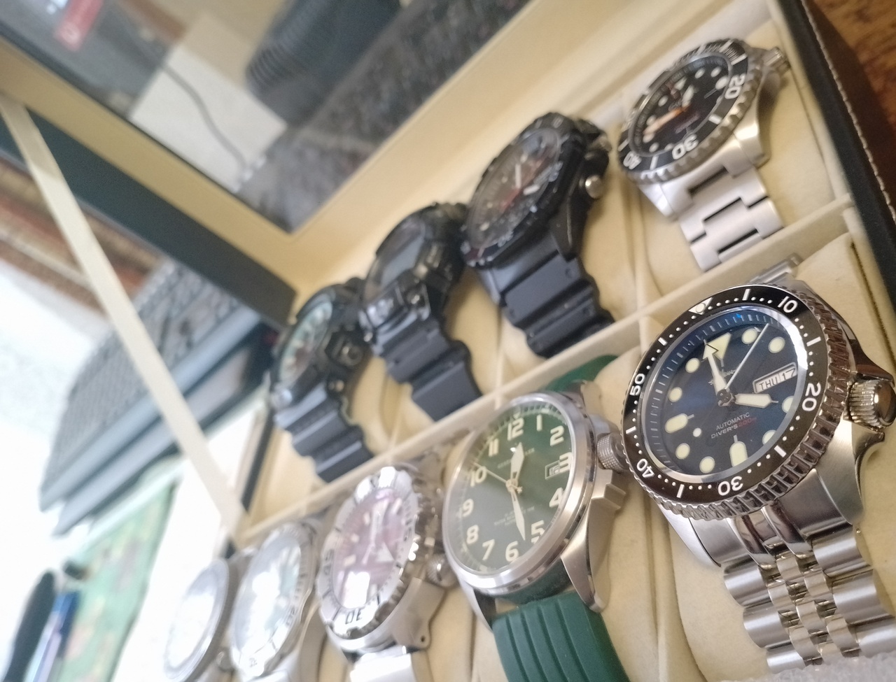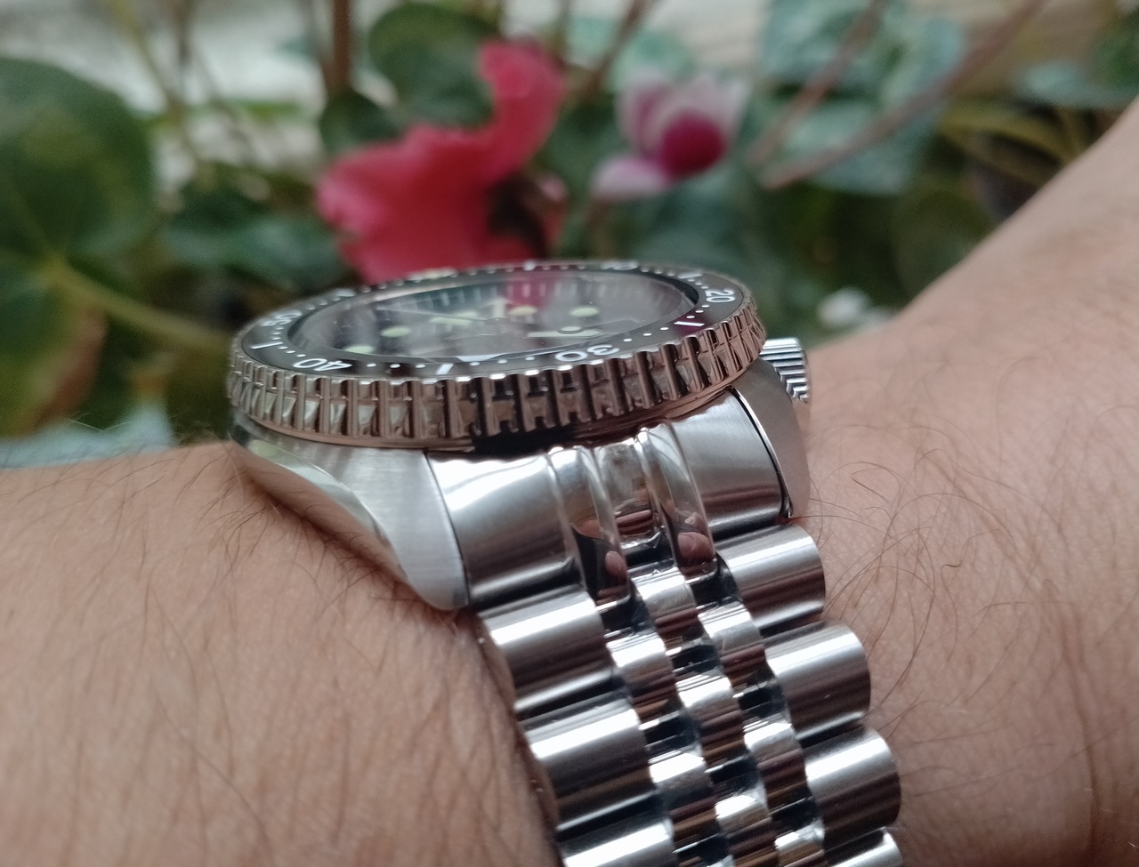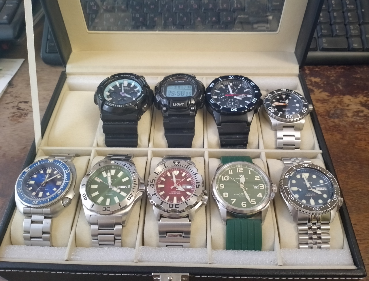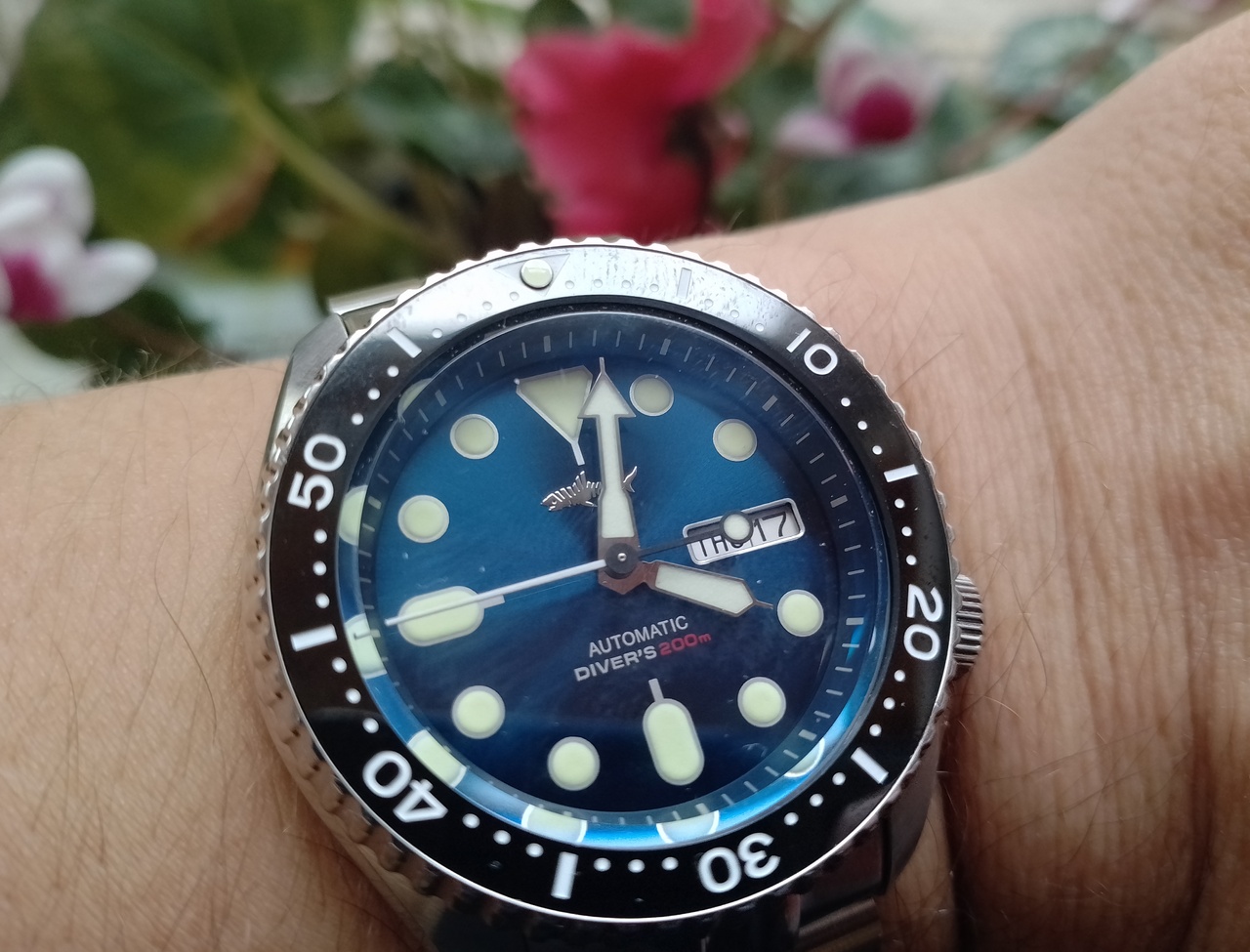 Приехали ко мне часики, хомаж на Seiko SKX007 от HeimDallr. Очень понравились, как и ожидалось - качество на высоте, заказал опять от HeimDallr, потому что у меня уже есть часы от этого китайского бренда (хомаж на Seiko Monstr v3 в бардово-рубиновом варианте). Исполнение очень понравилось, качество отличное, цвет циферблата - это просто нечно неописуемое, на фотографиях у продавца он смотрится как чёрный, хотя заявлен как синий, на самом деле, в живую, он почти чёрный с очень глубоким отливом в тёмно-тёмно синий (чернильный), я бы сказал - цвет ночного океана - класс! Я как раз не хотел синий, а хотел почти чёрный, так и есть. То ли это играет антибликовое тёмно-синее покрытие стекла, то ли циферблат имеет такой классный оттенок. Сапфировое стекло имеет небольшую фаску по краю, что придаёт дополнительного шарма, метки чуть преломляются при некоторых ракурсах. Взял специально на юбилейном браслете, никогда не было у меня такого, а обычный трёхзвенный ойстер как-то уже поднадоел. Снял четыре звена, в комплекте станочек и мини-вилочка для снятия шпилек, талончик гарантийный и книжка-мануал. Коробка сама добротная. Вообще, у HeimDallr традиционно - отличная комплектация и упаковка, определённо могу сказать, что это теперь один из моих любимых микро-брендов. Отделка по корпусу очень аккуратная, стекло - сапфир, безель имеет керамическую вставку и левостороннюю трещётку на 120 кликов, причём вращение очень приятное на слух с характерным сдвоенным щелчком, очень классное! Заводная головка большая, ухватистая и имеет очень большое количество витков, что здорово! Юбилейный, пятисоставной браслет выглядит довольно просто, но я от него и не ждал каких-то чудес особенных, застёгивается, удобный, да и ладно; укорачивается легко, в комплекте станочек для выталкивания межзвенных шпилек. Люм заявлен C3 швейцарская люминова, по факту, она и есть, светится очень сильно от кратковременного засвечивания любым источником света, как долго будет светиться, не знаю, кому интересно, могу отписаться завтра. Давно хотел этот вариант дайвера хомаж на SKX007, необычные стрелки, большие круглые метки, отличная читаемость! Долго изучал тему рождения SKX007 от самых первых дайверов Сейко 62MAS и до Seiko 5, дизайны на столько похожи, что не понятно, собственно, на какую модель это хомаж, то ли на SKX007, то ли на Seiko 5, но получилось классно. Длиннющая секундная стрелка с точкой-противовесом очень эффектно смотрится. Часы не тяжёлые, видимо, отчасти из-за юбилейного лёгкого браслета. Что могу сказать: приятно держать в руках, приятно на них смотреть, приятно их носить, реально получаю удовольствие от использования! Могу снять видео, если кому надо. Короче - рекомендую. В плане цены, средняя цена на известной площадке варьируется от 12 до 16 т.р. Мне удалось ухватить за 11800р. по акции!