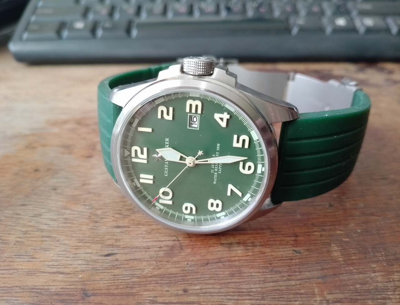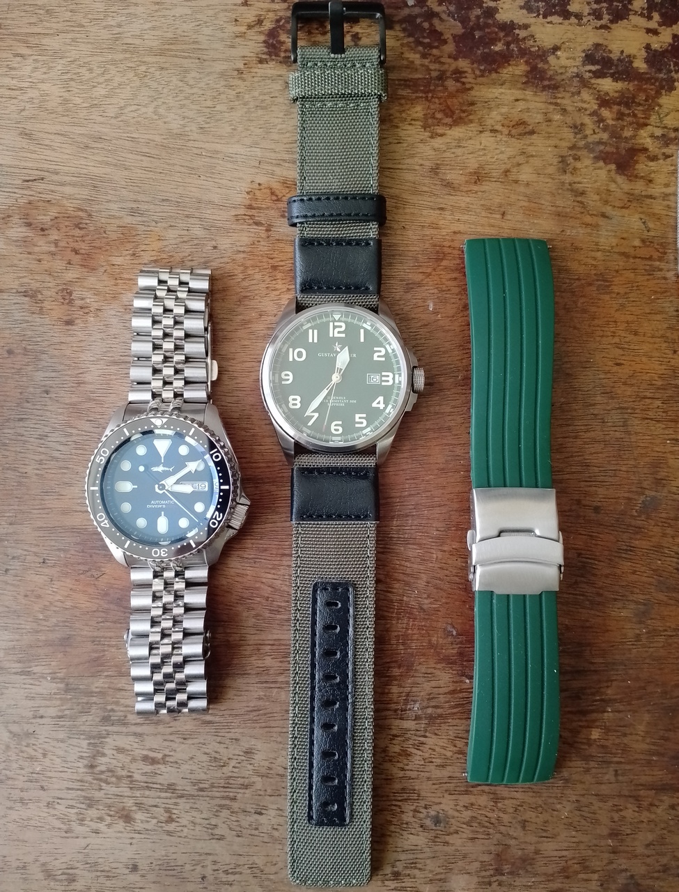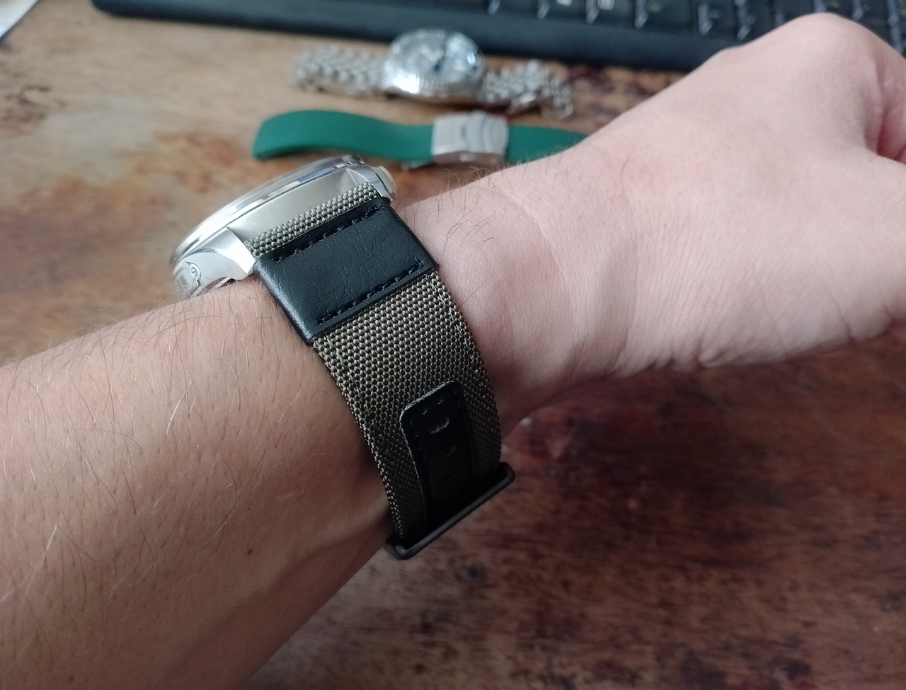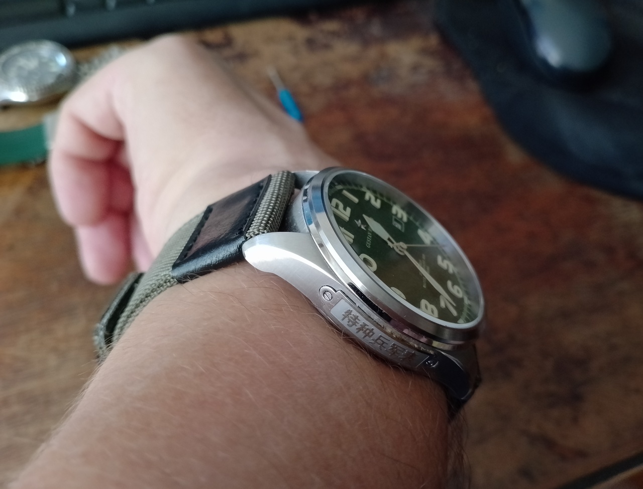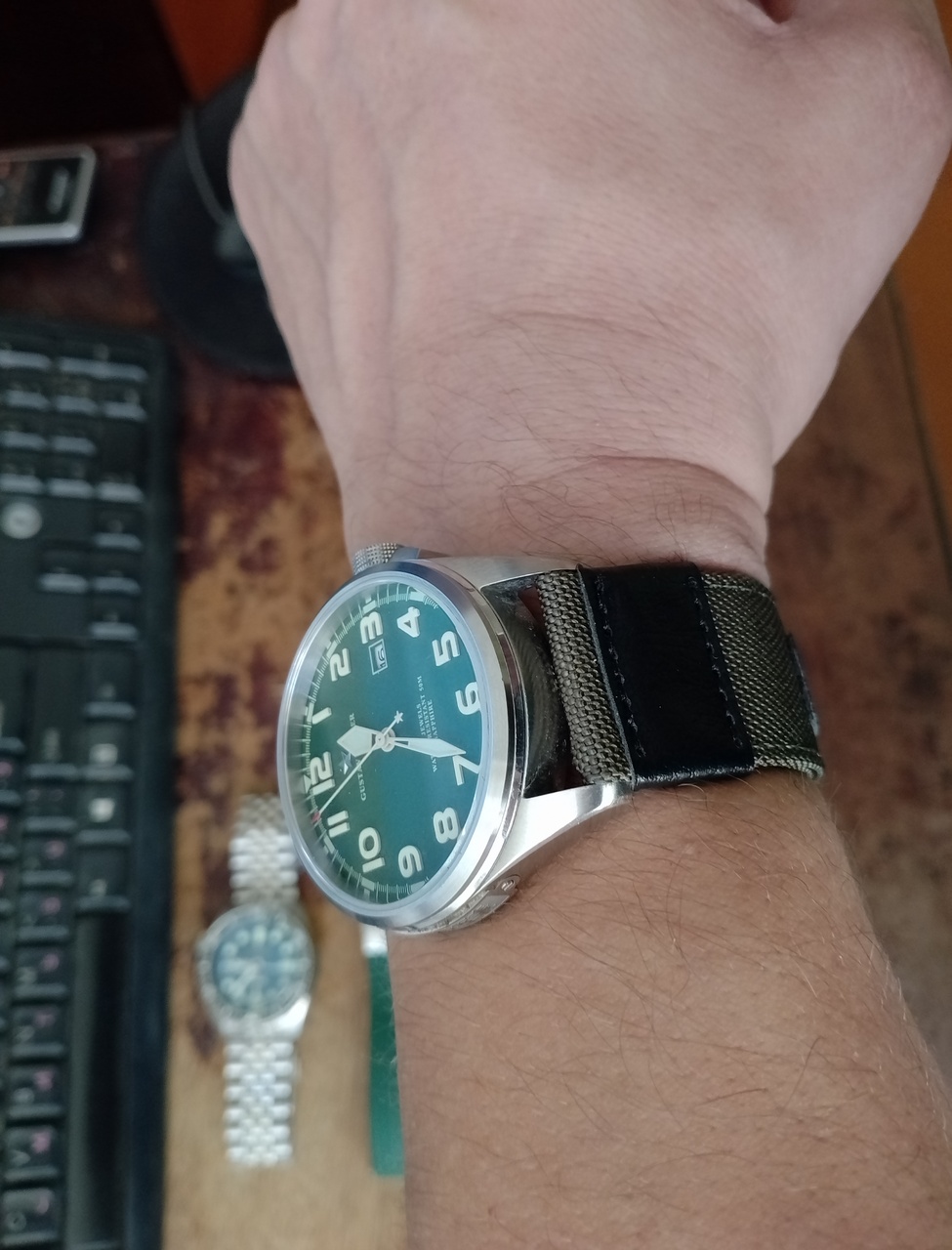 Сегодня пришёл нейлоновый ремешок. Заказывал себе для Густав Беккер (китайские командирские :-)). Перепробовав на них кучу разных вариантов, от кожи и браслетов и, вплоть до силикона, решил, всёж-таки, остановиться на нейлоновом ремешке цвета хаки с чёрными вставками из кожзама, получилось, как мне кажется, классно. Ремешок отличный и этим часам очень идёт, в стиле миллитари самое то.