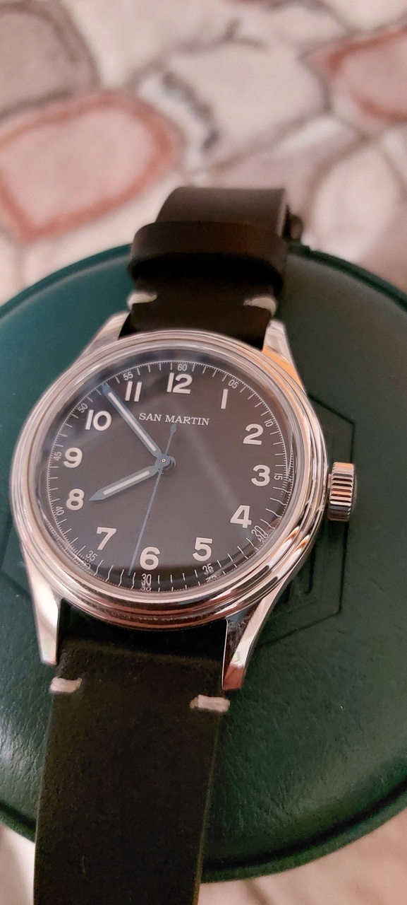 Похвалю свежеприобретенный Сан мартин. У Дэна гетатру на обзоре были такие же, только с желтым цифером. Я больше люблю черные "злые" циферы. Люм однородный, правда не очень долгоиграющий. Стрелки вылитые востоковские, веет чем то родным даже. Есть мысль покрасить секунду в красный на манер швейцарии 50-х. Ее очень плохо видно, надо присматриваться.