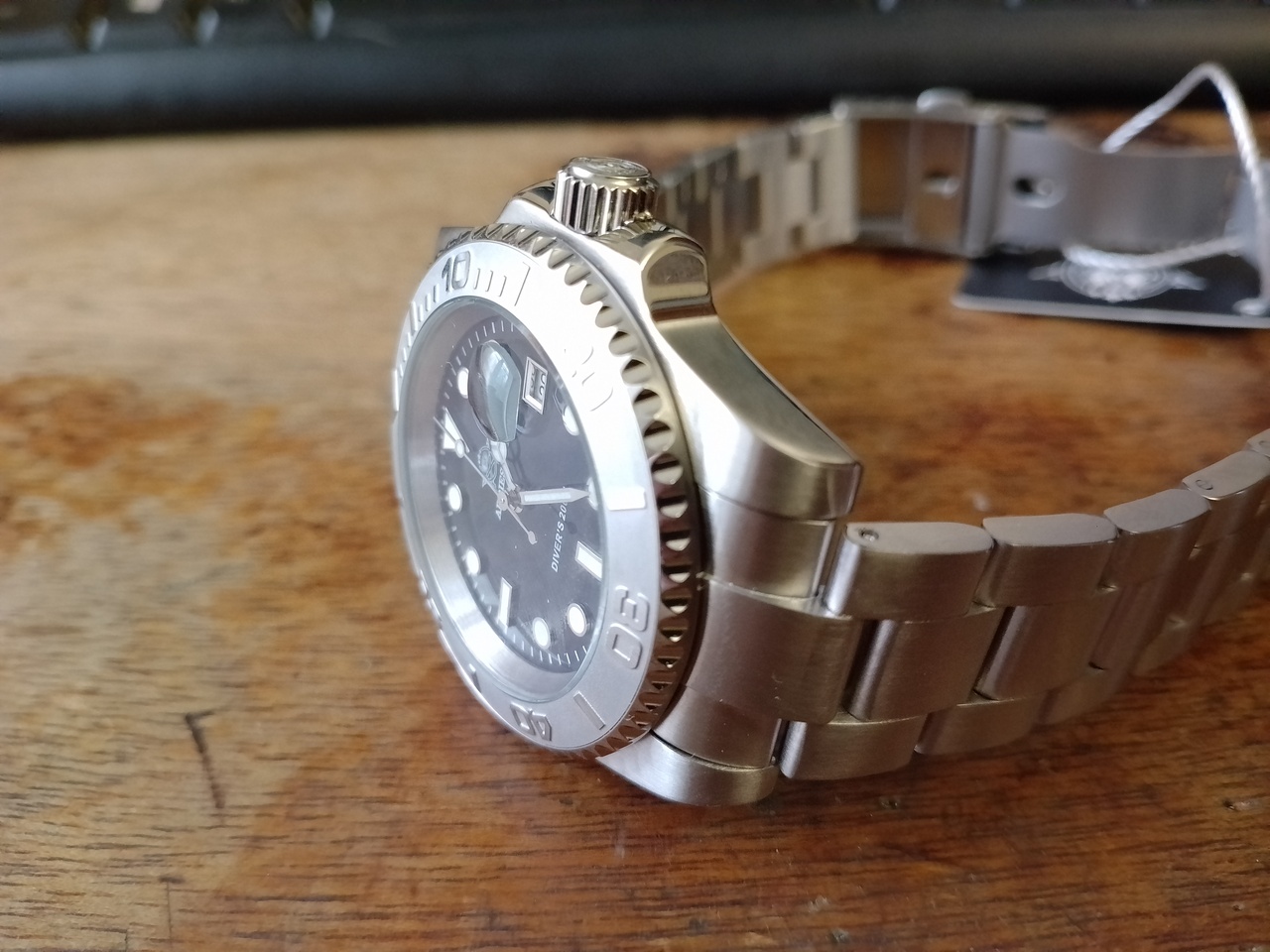 200м, минералка хардлекс, сталь. Понравилась коронка, крутится приятно, особенно резьба завинчивается долго и приятно, головка-коронка ухватистая и удобная, число даты вручную головкой переключатся очень мягко, плавно, очень удобно. Задняя крышка имеет лазерную гравировку, которая очень шершавая на ощуп, но при ношении часов это, почему-то не мешает. Обработка браслета хорошая, нигде ничего не режет, все плавно и достойно. Купил в наивной надежде, что там будет люминова, которая заявлена продавцом :-))) Наивность!!! :-))) Конечно же там нет никакой люминовы, особенно BGW9, как указал продавец. Там какая-то лажа, которая вообще не светится почти. Ну, да ладно..., часики симпатичные, лёгкие и достаточно тонкие, чтобы носить удобно под рукав рубашки, или под костюм, и, так как все мои кварцевые часы сводятся к ДжиШокам размером с хоккейную шайбу и часам, похожим на ДжиШоки, типа Casio W-736H-1A, чего-то маленького и повседневного не было, поэтому решил попробовать такой вариант. Эффекта "Вау" не наблюдается, часы аккуратные, симпатичные, отделка по металлу корпуса и браслета хорошая, на четвёрочку, корпус по бокам полированный, сверху сатинированный, браслет сатинированный. Стрелки и метки полированные, переливаюся и блестят, стрелки тонюсенькие, поэтому слепые, читаемость никакущая, особенно в пасмурный день, или вечером и ночью. Что можно сказать, рад ли я покупке, наверное нет, буду ли носить такие часы, наверное, да, как ни к чему не обязывающий вариант, который можно выхватить на бегу из шкатулки и нацепить на руку без необходимости заводить и выставлять время и дату. Купил по акции за 4113 руб. Наверное, больше бы за них не заплатил, но за эту цену на повседневку нормальные, даже, можно сказать, красивые! Сам не являюсь поклонником дизайна Кроллекса, но решил попробовать часы с "циклопом", кто-то говорил, что в них ничего не видно, и они (циклопы) лишь мешают, мне наоборот показался он очень удобным, дату, во всяком случае, в нём видно отлично и чётко и увеличение большое, правда перегораживает добрую четверть циферблата :-). Покупку считаю временным средством купирования часовой болезни в перерывах между выбором "своих" "особенных" часов :-)))
