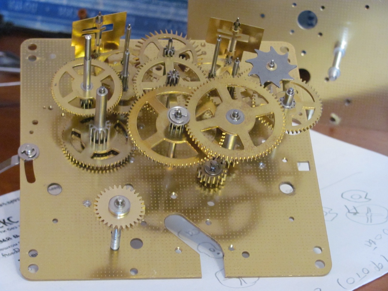 2. В приводе от жильного барабана к механизму хода присутствует дополнительный "паразитный" триб. Видимо, из-за частичной унификации с вариантом, где ход тоже был пружинным. В качестве жилы - тонкий стальной тросик (на форуме как-то утверждали, что так не делают). Жильный барабан имеет ограничитель количества оборотов, но не мальтийский крест, а пару колёс с различной глубиной впадин и высотой зубьев. При разматывании жилы барабан стопорится, когда на нём остаётся чуть более полвитка. Но гири доходят до дна корпуса когда на барабане ещё порядка 4-х витков! Ощущение, что механизм конструировался по корпус ещё большей высоты. А если попытаться собрать ограничитель так, чтобы он нормально ограничивал ход гирь вниз, то он перестанет ограничивать ход вверх, что тоже нехорошо.