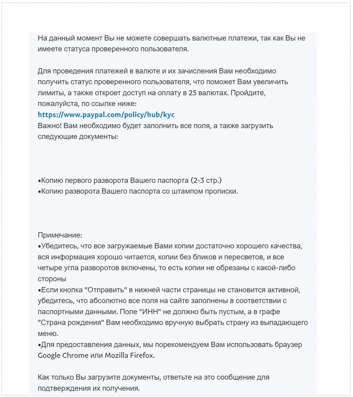 Последний раз я пытался оплатить валютный счёт в сентябре. Это информация от саппорта PayPal, которую я как раз тогда и получил.