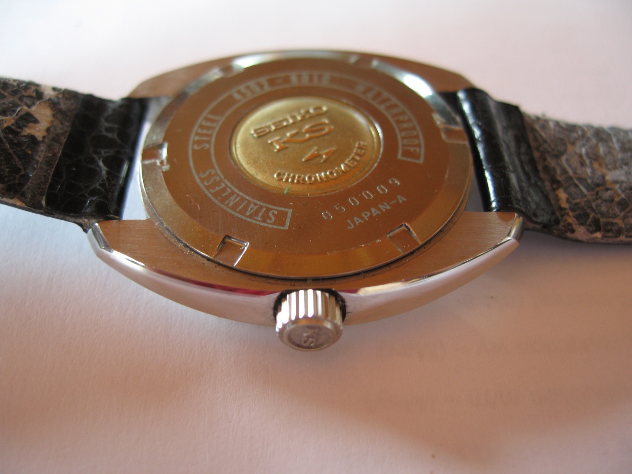 King Seiko сзади было изображение щита с крестом и коронами. Корпус gold-filled (напрессованное золото) Стекло - пластик, крышка хлопушка. Достаточно тонкий корпус для того времени. На заводной головке – буква S.