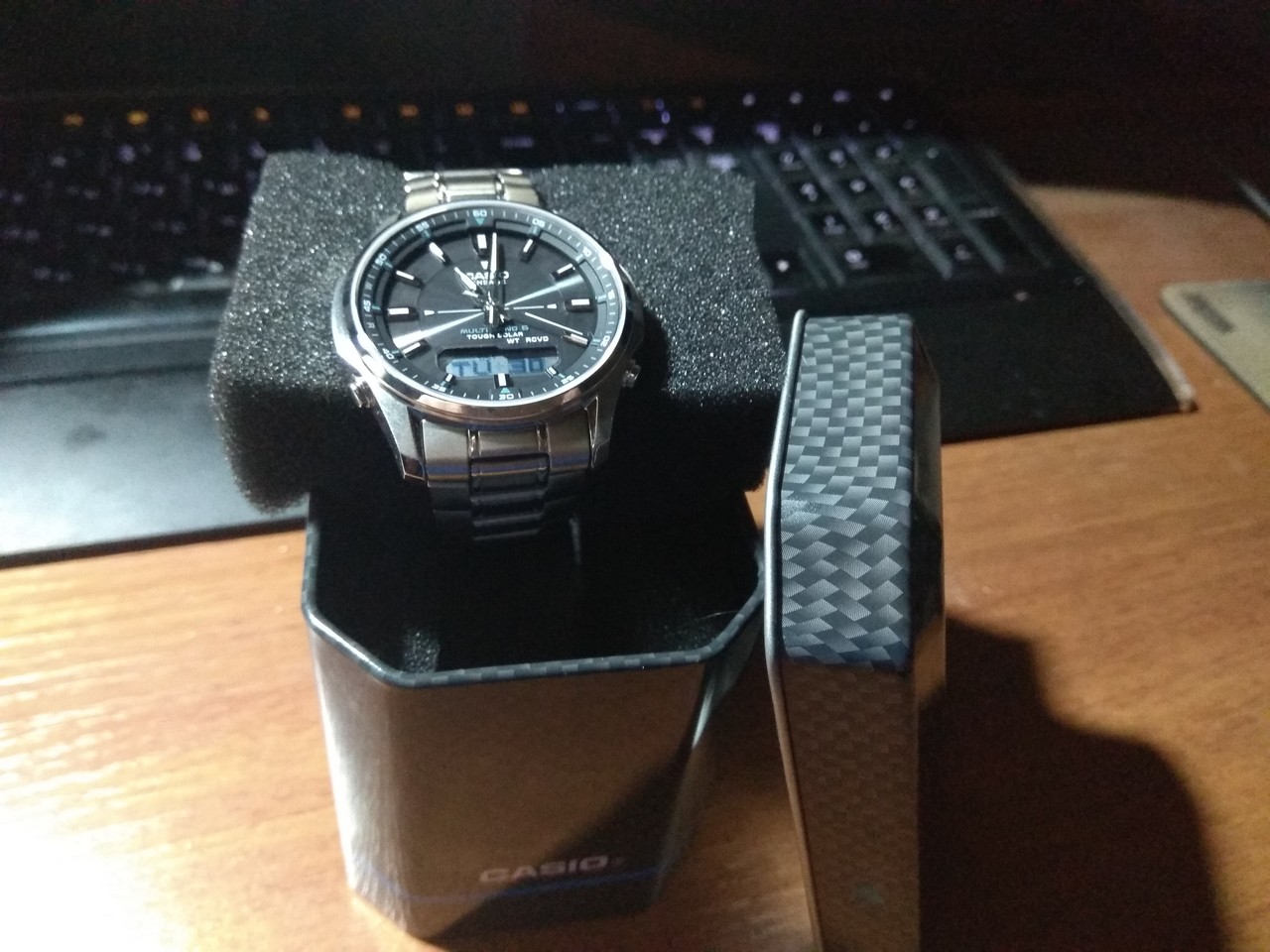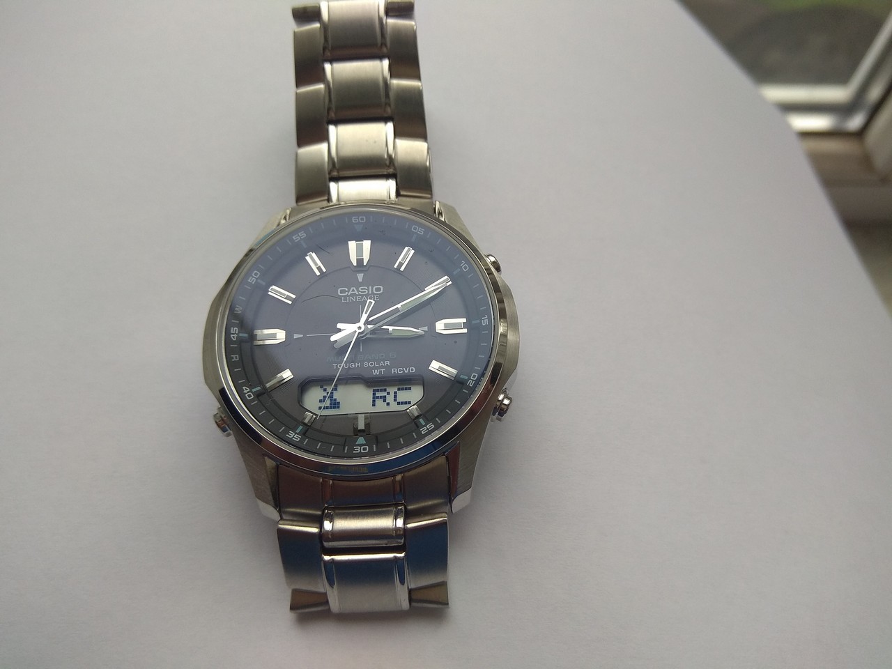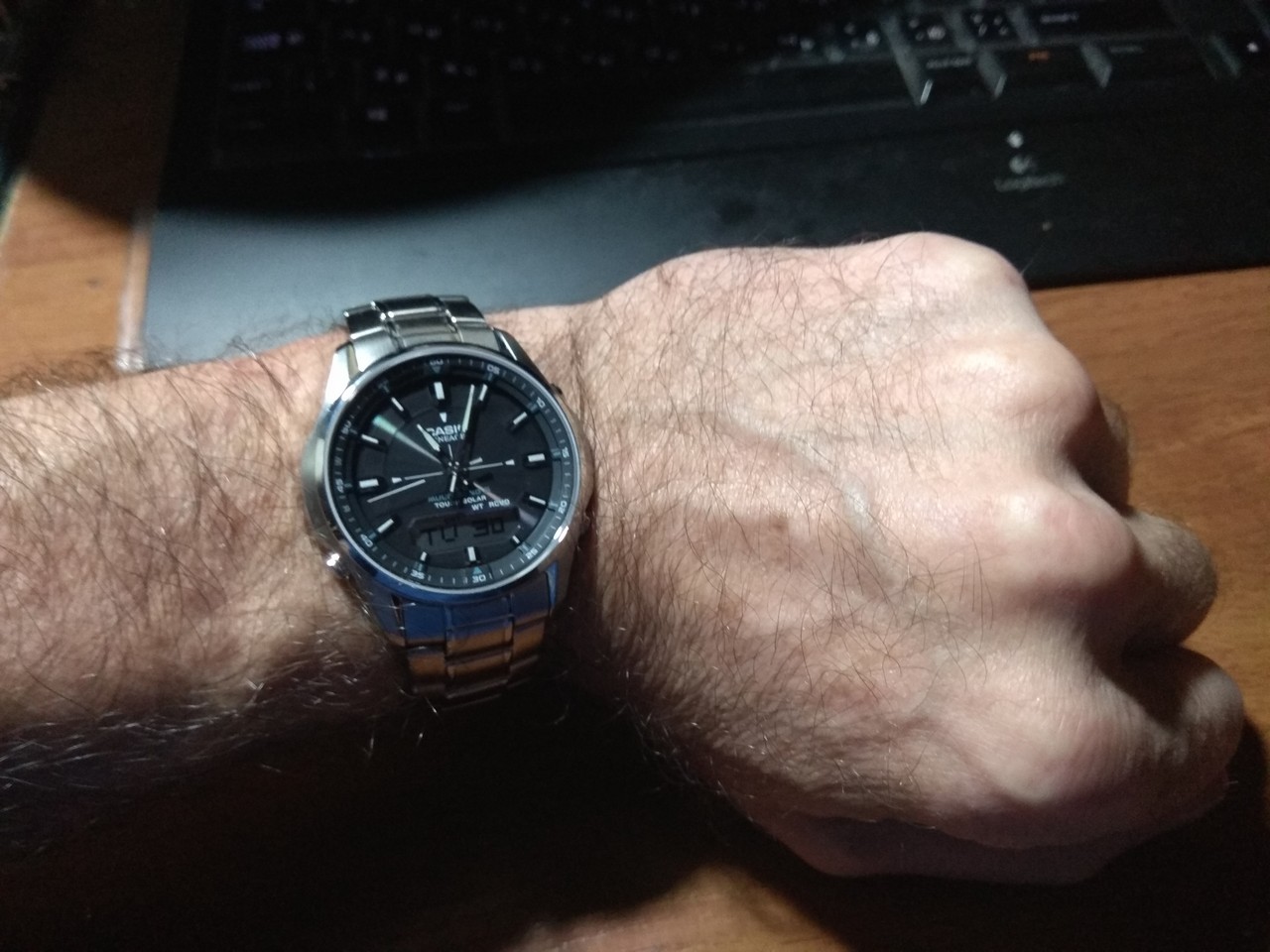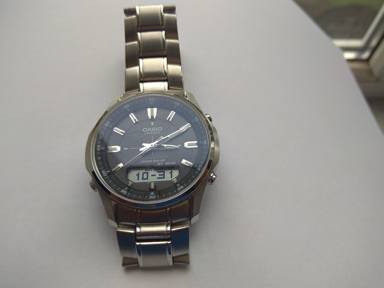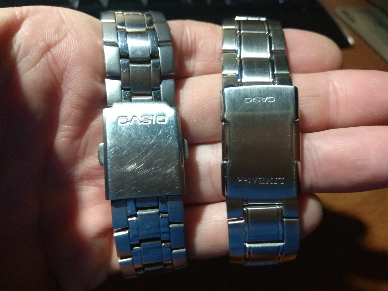 Вчера забрал из магазина Casio LCW-M100DSE-1A. Первые впечатления: внешний вид - свою цену отбивают на 150%. Солидно, но сдержано, со вкусом, без лишних понтов. Часы предполагались на повседневку на выход, были опасения, что цифер с жк экранчиком под костюм будет не комильфо. Ничего подобного. Пойдут и под костюм, и под кежуал, и под более спортивный вариант одежды (майка, тенниска). Второе опасение было, что размер часов будет маловат, маялся между этими часами и Casio LCW-M170D. Оказалось, опасения напрасны, на моё запястье 17 см - вот самое то, ни мал, ни велик, точно в десятку. Собирался брать под эти часы ремешок, но, увидев браслет - теперь подожду. Браслет очень приятен, волос не дёргает, на руке сидит комфортно. Сразу из магазина зашёл к часовщику, подогнал браслет по руке. На моё 17-см запястье - убрали 4 звена. Что ещё понравилось по браслету - кнопки застёжки-бабочки заподлицо с боковыми поверхностями застёжки (на фото можно увидеть сравнение с застёжкой Casio EF-304D-1A).
