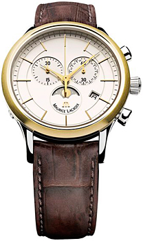 Кварцевый хронограф с секундомером. Индикатор даты и фаз луны. Выпуклое сапфировое стекло с внутренним антибликовым покрытием. Корпус из нержавеющей стали с желтым PVD покрытием. Кожаный ремешок. Диаметр корпуса 40 мм.