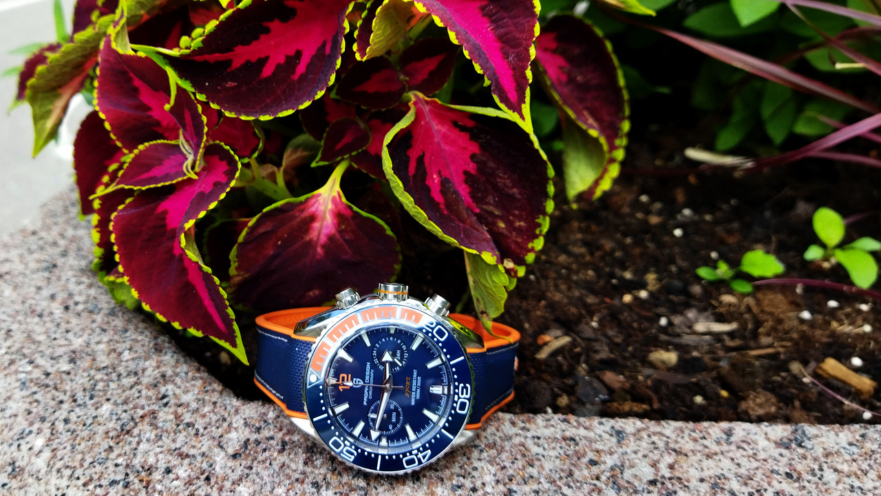 Больше всего боялся судорожно дрыгающуюся секундную стрелку, но как обычно ступил и не учел, что часы хронограф и секундная стрелка 95 процентов времени будет стоять на 12. Хронограф работает нормально, отсчет минут по малому циферу на 9. Цифер на 3 это 24-ех часовой отсчет. Силиконовый ремешок красивый и приятный. Застежка непривычная, но удобная и не расстегивается. Размер ремешка "китайский", т.е. на запястье 19 см придется носить на последней/предпоследней дырочке. Часы относительно тяжелые, 109 граммов, что радует . Люблю увесистые вещи
