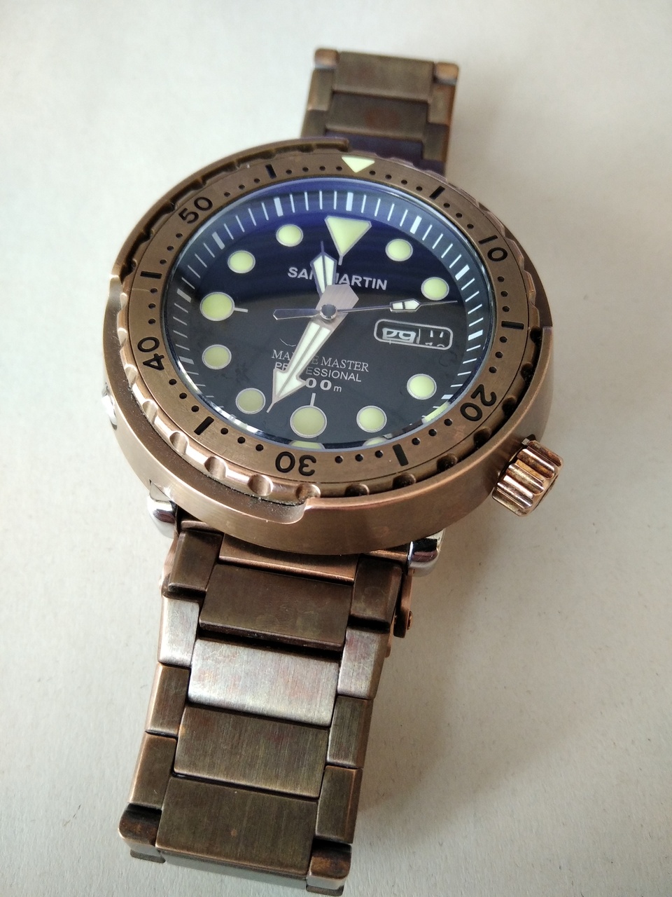 Разве это так работает? Пятна на запястье в 1-2 см от часов и бакли - при загибе ладони кожа касается боковых поверхностей и окрашивается в сине-зелёный цвет...как-бы ни была интересна бронза, пока вывод, что все-таки не для лета и потных рук. Опять же есть подозрение, что часы на руке от пота теряют патину и светлеют, ну и равномерность этой патины под вопросом, а в случае крупных часов и браслета - вес. Не вижу эстетически бронзу иначе как на кожаном ремне коричневого цвета.
