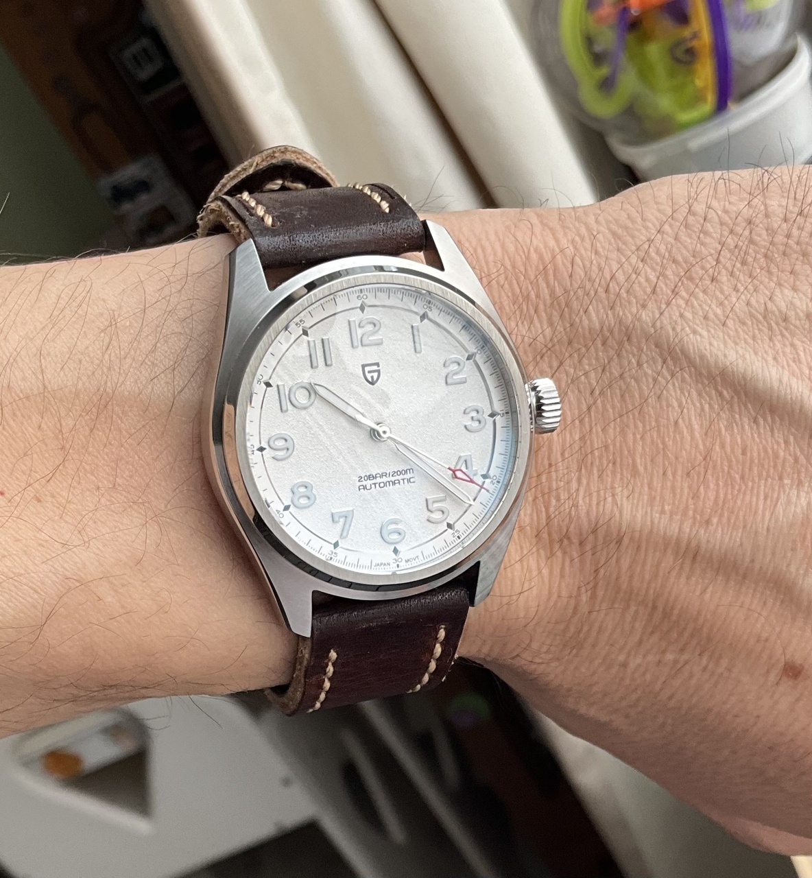 Часы, кстати, классные, лёгкие, очень читаемые и точные в плане механизма. На коричневом ремешке получилось здорово, как мне кажется.