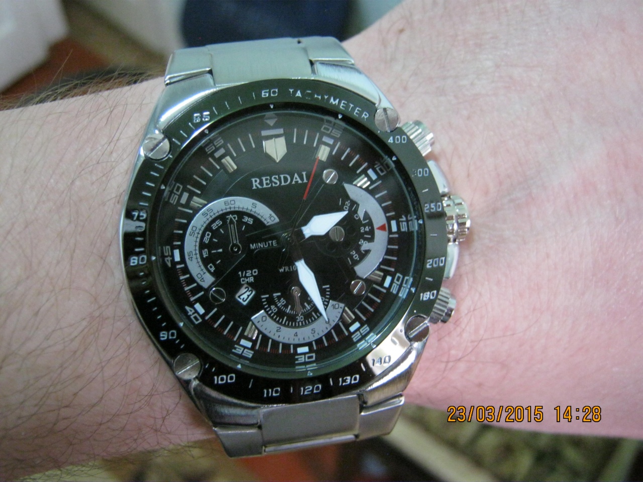 Часы Resdai. Производство скорее всего Китай. Куплены на Ebay за 17 долларов. Никаких документов и коробки естественно нет. Браслет литой из нержавейки, корпус скорее всего из латуни, пока не проверял. Календарь рабочий, все остальные мелкоциферы - бутафория. Люм на стрелках вполне добротный - светит долго.