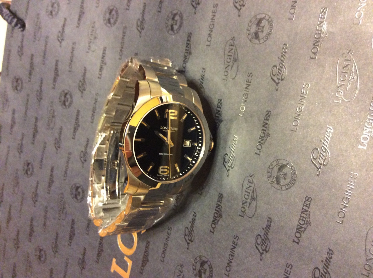 Longines Conquest кварцевый трехстрелочник с черным циферблатом на стальном браслете. Водозащита 300 м, завинчивающаяся заводная головка, стекло сапфир, застежка бабочка.