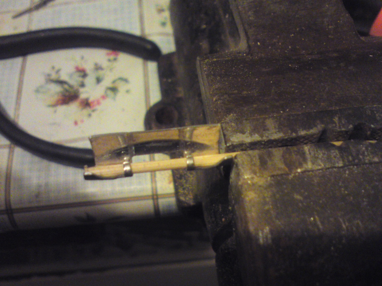 Отверстие в следующем звене я рассверлил до 1.8 мм под новые шпильки. Теперь осталось найти из чего сделать втулки. Я искал что нибудь латунное и по чистой случайности мне тут же попались контакты из разъема ШР. Диаметр отверстия под провод оказался 1.8, отлично, втулка готова!
