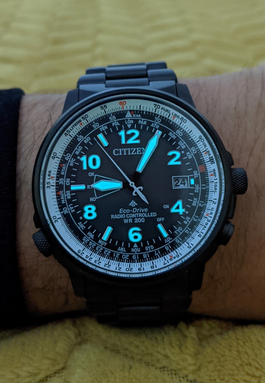 С одной стороны, часы в целом выглядят так же или даже лучше, чем на хороших фото, которые тут некоторые камрады публиковали. То есть, все, что обещано, присутствует. Особенно порадовало цветовое оформление – густо-тёмно-синий цвет цифера и контрастные белые и желтые метки. Все хорошо и на ощупь – отлично вращается шкала линейки, браслет не брякает и прекрасно прилегает к часам. Порадовал люминофор – часов 6 в темноте еще можно разобрать, какое время показывают часы. И цвет зеленовато-бирюзовый тоже понравился.