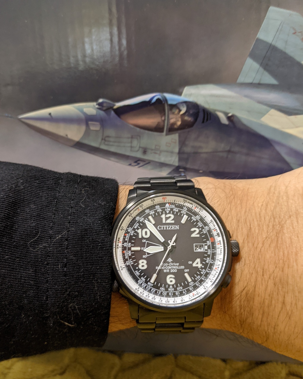 Когда я стал подбирать себе эти часы сейчас, старых версий было уже практически не найти (по старой цене в долларах), но зато в продаже были Blue Angels, которые мне понравились больше. Посмотрел еще на множество фоток и решил брать. Купил на канадском ebay, цена была самая адекватная. Человек там цену периодически немного меняет: долго висят часы – снижает, продались несколько – повышает. В общем, имеет право, все равно у него всегда в наличии и хоть немножко, но дешевле, чем на том же JS.