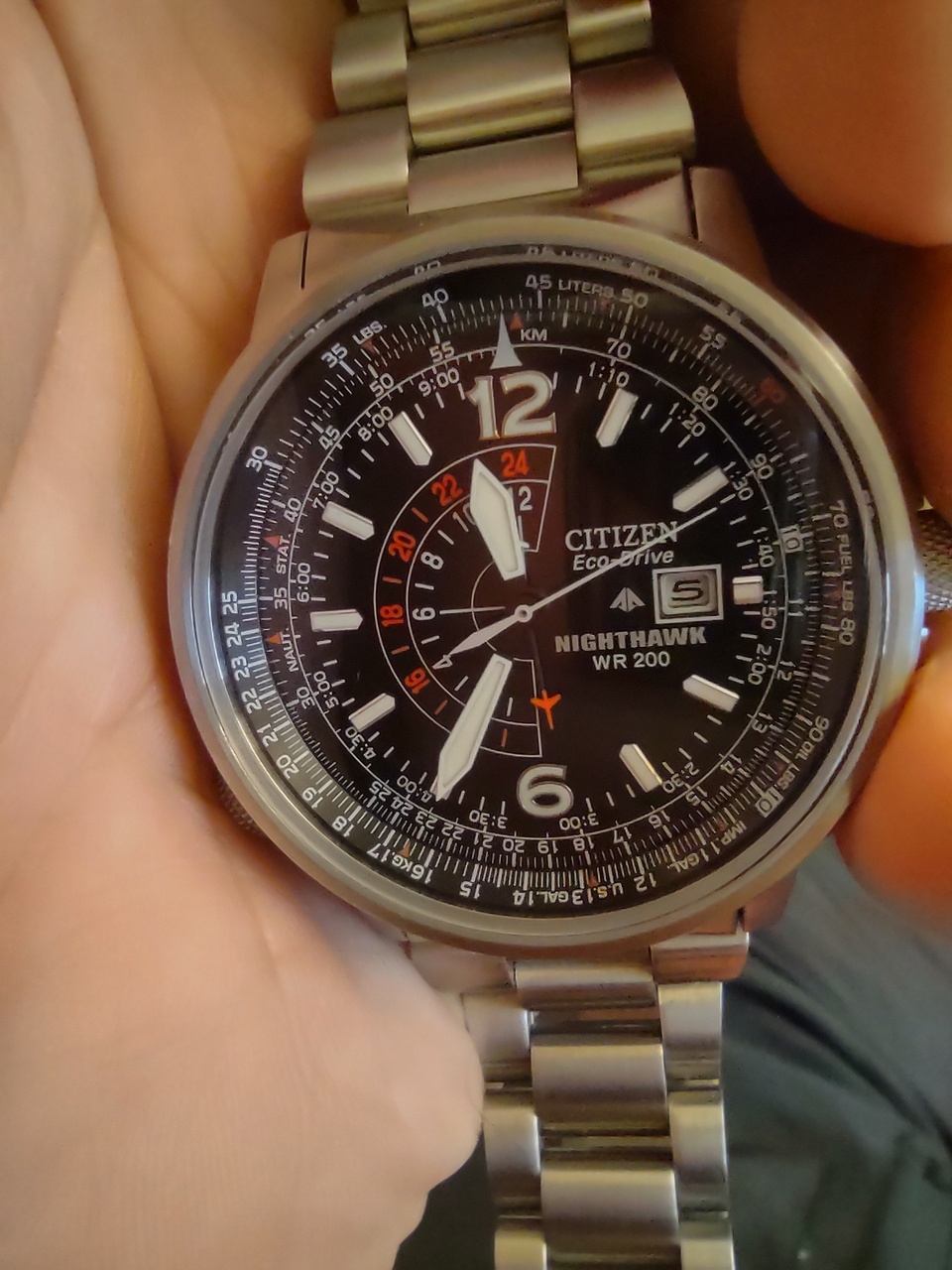 Вообще, про стальную американскую у меня насчиталось больше "за", чем про других. Ангелы не зашли из-за синего безеля, азиатская версия с красивой крышкой проиграла индексами и отсутствием надписи Nighthawk на циферблате. Некоторые не нашел на браслете. Например, коричневые. Покрытия не рассматривал как класс. Долго мозговал над титаном, но перевесили самолётики и форма звеньев стального браслета. В итоге остановился на православной стальной версии на великолепном браслете, с полностью лиминофорными индексами, стальным рантом, 24h самолетиками и надписью Nighthawk на циферблате. Не остановила даже минералка и отсутствие радио.