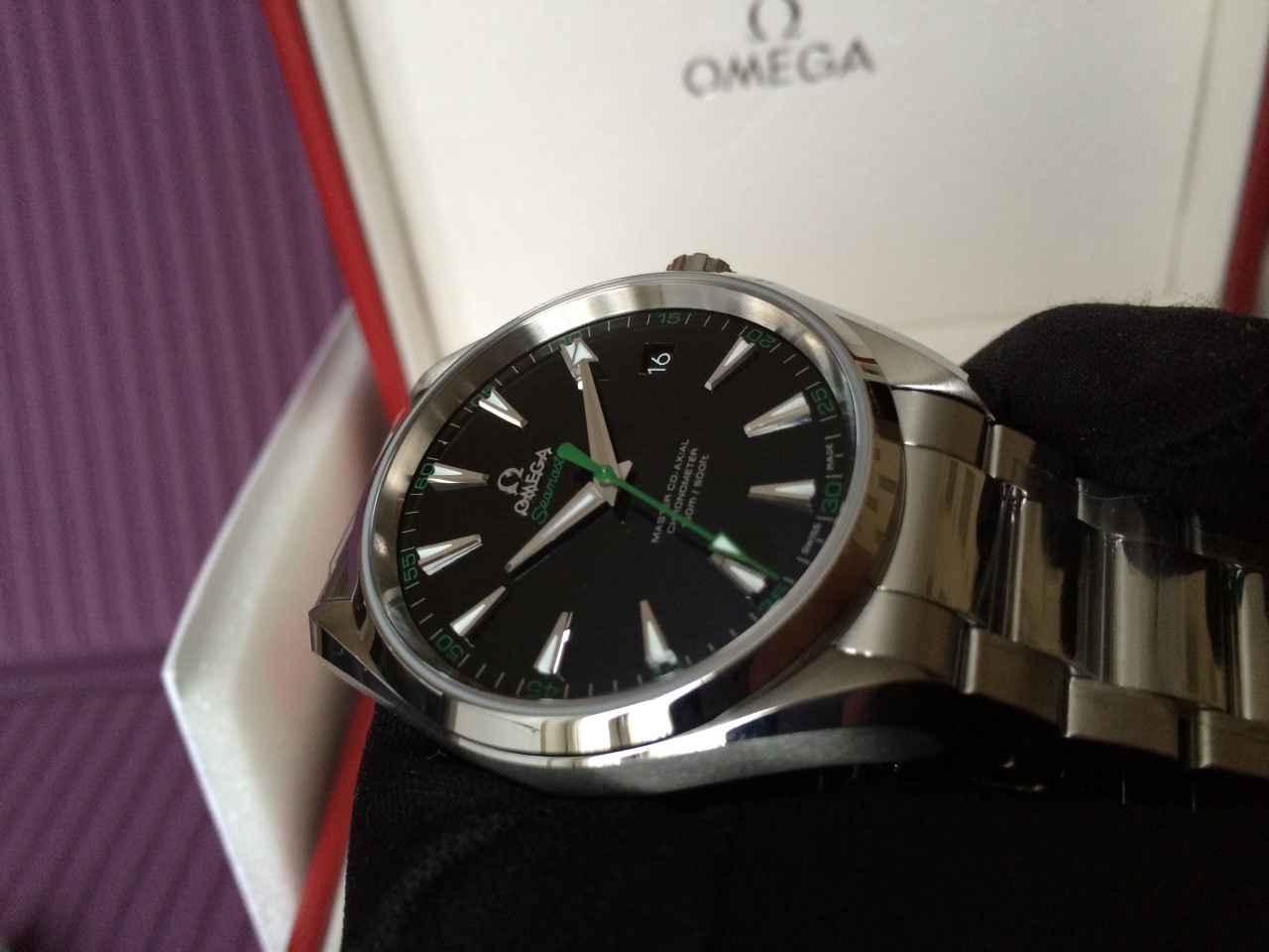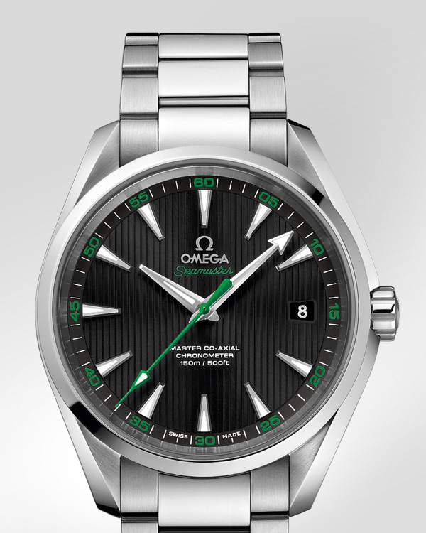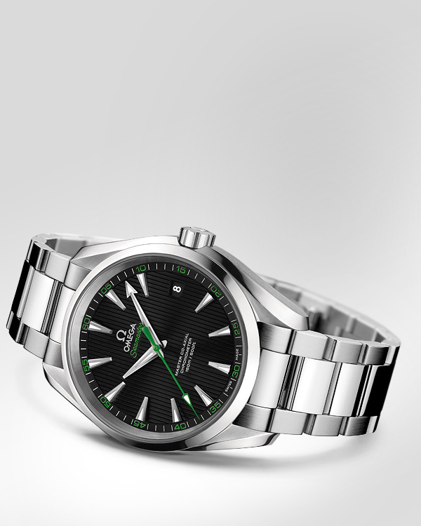 OMEGA Seamaster Aqua Terra 150M, напоминает тиковое покрытие роскошных яхт. Эта модель Seamaster Aqua Terra «Golf» имеет черный лакированный циферблат с радиальным сатинированием и узором из вертикальных полос (Teak Concept). Центральная секундная стрелка зеленого цвета гармонично сочетается с зелеными цифрами минутной шкалы. Корпус диаметром 41,5 мм из нержавеющей стали дополняет стальной браслет. В этом сертифицированном хронометре используется часовой механизм